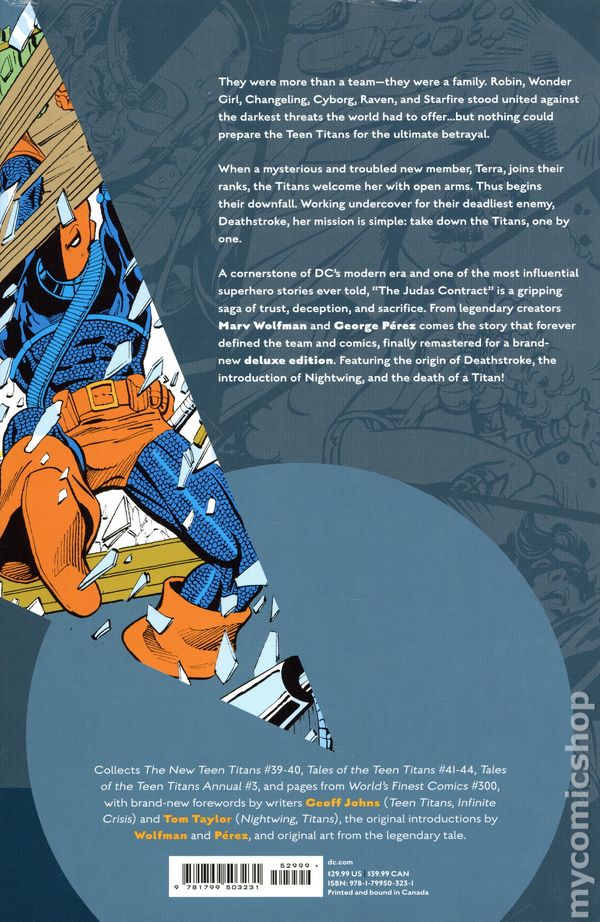 2nd Edition - 1st printing. Collects The New Teen Titans (1980-1988) (Tales of... Vol. 1) #39-44, The New Teen Titans (1980-1988) (Tales of... Vol. 1) Annual #3, and , and pages from World's Finest (1941-1986) #300. Written by Marv Wolfman. Art by George Pérez, Dick Giordano, Mike Decarlo, and Romeo Tanghal. Cover by George Pérez. THE LANDMARK EPIC THAT FOREVER DEFINED THE NEW TEEN TITANS, REMASTERED FOR A CELEBRATORY, BRAND-NEW DELUXE EDITION! The secret origin of Deathstroke! A traitor in the Teen Titans! The introduction of Nightwing! And the death of a member! Celebrate one of the greatest Teen Titans stories ever told with this oversize hardcover deluxe edition. Fully remastered, experience the story that rocked DC Comics and changed the Titans forever. Hardcover, 216 pages, full color. Teen Cover price $29.99.