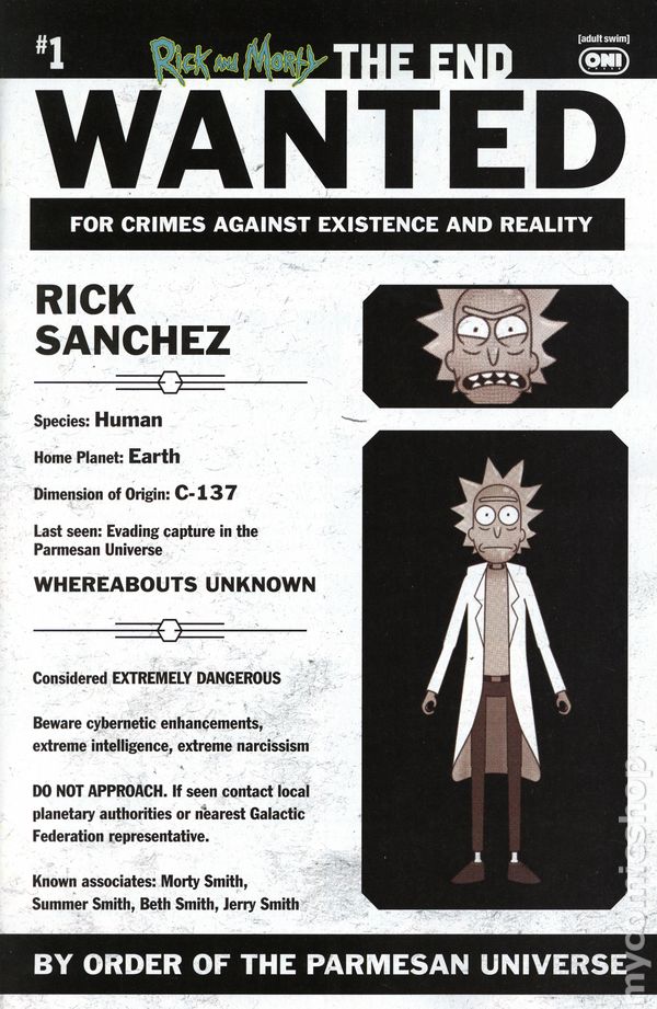 (W) Daniel Kibblesmith (A) Jarrett Williams (CA) Dave Bardin OUT OF THE SMOKING RUINS OF RICK AND MORTY VS. THE UNIVERSE (ON SALE NOW!!!)—AN ALL-NEW, MEGA-IMPORTANT MILESTONE FOR THE OMNIVERSES MOST DYSFUNCTIONAL PAIR OF SCIENCE ADVENTURERS STARTS NOW! Rick Sanchez, the most wanted man in this and every other universe, is on the run. With a bounty on his head, every government, military, pirate, mobster, bounty hunter, bail bondsman, religious institution, theater troupe, circus clown, and endangered species is on the hunt to bring in Rick—DEAD OR ALIVE. The only one who can bring Rick in warm is the one person who knows him best: Morty Smith. But Mortys not the only Smith hot on Ricks trail . . . Beth Smith is determined to bring Rick in, and she doesnt particularly care how. Now its just a question of who can get to him first! Cosmic annihilators Daniel Kibblesmith (Loki) and Jarrett Williams (Speed Force) continue their epic re-evolution of Rick and Morty in a brand-new limited series with epic repercussions for whats coming next! 32 pages, full color, rated mature. Cover price $4.99.