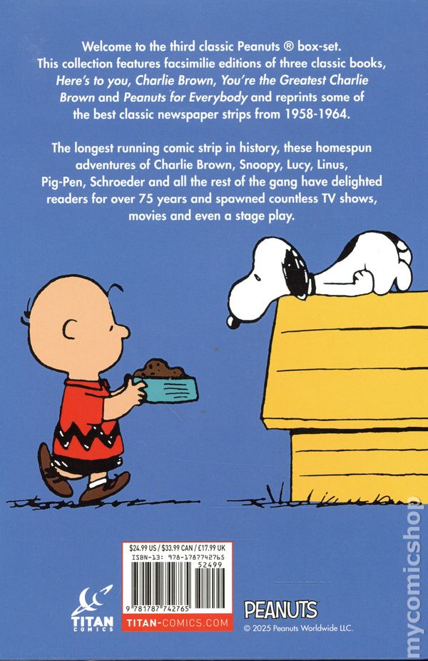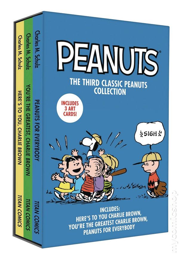 Set Includes 3 Volumes (with Slipcase) - Printings May Vary. CELEBREATE THE 75TH ANNIVERSARY OF PEANUTS! OVER 360 PAGES OF CLASSIC PEANUTS NEWSPAPER COMIC STRIPS FROM 1958-1964. This box-set collection of three classic Peanuts comic strip books includes Here's to you Charlie Brown, You're the Greatest Charlie Brown and Peanuts for Everyone. With each book containing 128 pages to enjoy. The box-set also includes three exclusive art cards. Softcover (3 Volumes with Slipcase), 5-in. x 7-in., 384 pages, B&W. All Ages Cover price $24.99.