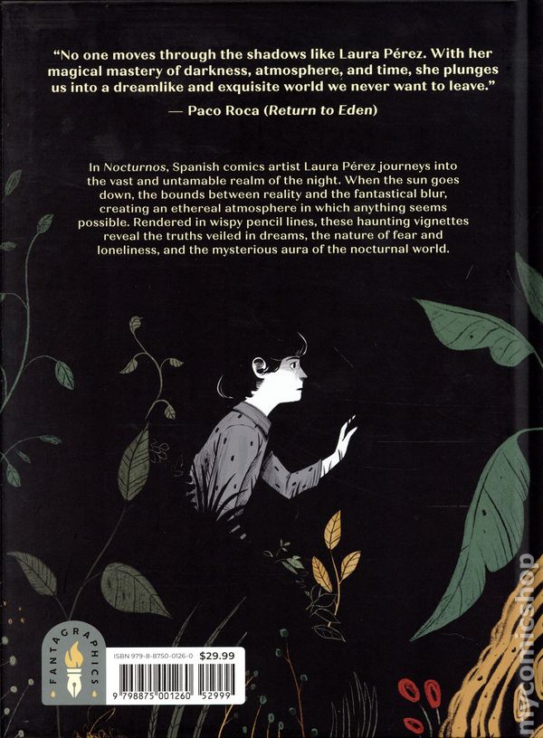 1st printing. Story and art by Laura Perez. The night does not belong to us. She harbors her own mysteries. NOCTURNOS delves into the ethereal world of the night, when the mundane vibes of the day cede to a mysterious atmosphere in which anything seems possible. In the twilight hours, the darkness feels vast and untamable, the dead can intrude upon the land of the living, and the distance between imagination and reality seems closer than ever. Haunting narration connects a series of vignettes that capture glimpses of peoples lives as they navigate the nighttime. A traumatic collision while driving down a dimly lit road; a bedtime story that blurs the bounds of the imaginary, a walk through the woods that leads to strange symbols; this nighttime tour encompasses lush forests, dreamscapes, and the shadowy corners of private rooms. Along the way, these stories question the truths veiled in dreams, the nature of fear and loneliness, and the unknowable aura of the nocturnal world. In NOCTURNOS, her most masterful work to date, Spanish comics artist Laura Pérez explores the magic and melancholy we encounter when dusk descends. Hardcover, 192 pages, full color. Mature Readers Cover price $29.99.