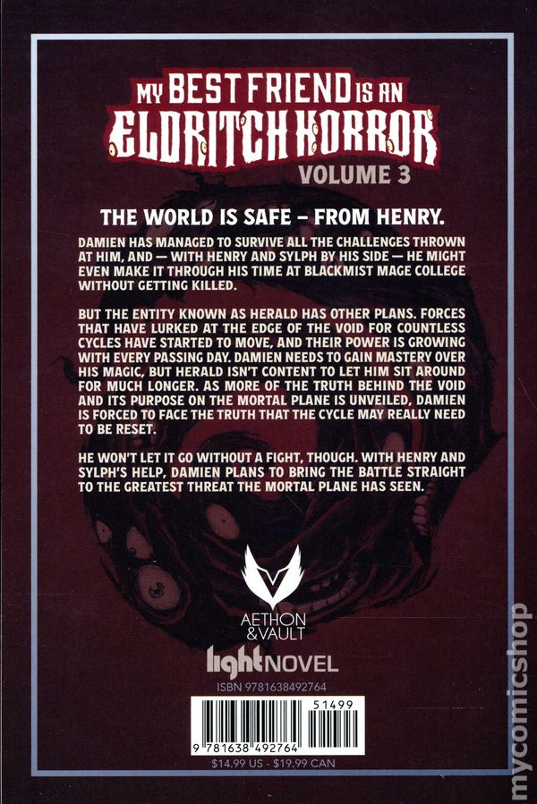 Volume 3 - 1st printing. Written by ACTUS. Art and cover by Blacklapiz. Magic and madness continue in MY BEST FRIEND IS AN ELDRITCH HORROR (Light Novel) VOL. 3! The world is safe – from Henry. Damien has managed to survive all the challenges thrown at him, and — with Henry and Sylph by his side — he might even make it through his time at Blackmist mage college without getting killed. But the entity known as Herald has other plans. Forces that have lurked at the edge of the Void for countless Cycles have started to move, and their power is growing with every passing day. Damien needs to gain mastery over his magic, but Herald isn't content to let him sit around for much longer. As more of the truth behind the Void and its purpose on the Mortal Plane is unveiled, Damien is forced to face the truth that the Cycle may really need to be reset. He wont let it go without a fight, though. With Henry and Sylphs help, Damien plans to bring the battle straight to the greatest threat the Mortal Plane has seen. Softcover, 5-in. x 8-in., 216 pages, Text (B&W Chapter Illustrations). Cover price $14.99.