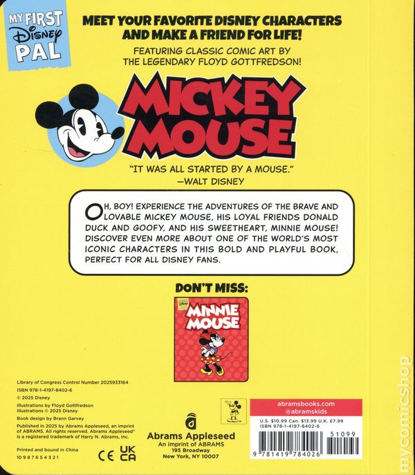 1st printing. Art and cover by Floyd Gottfredson. Meet your first Disney best friend, Mickey Mouse, in this colorful and collectible board book with gatefolds, featuring original comic book art by legendary Disney artists Floyd Gottfredson. Using original art by legendary Disney artist Floyd Gottfredson, known as The Mouse Man, this colorful and collectible board book is perfect to introduce Mickey Mouse to the youngest Disney fans. Jump into your first adventure with Mickey and revisit some of his most memorable moments! Meet his best friends Donald and Goofy, his sweetheart Minnie, and his dog Pluto throughout this interactive and highly collectible board book that features three gatefolds that can be lifted to add a playful touch! Hardcover, 6 1/2-in. x 7 1/2-in., 24 pages, full color. All Ages Cover price $10.99.