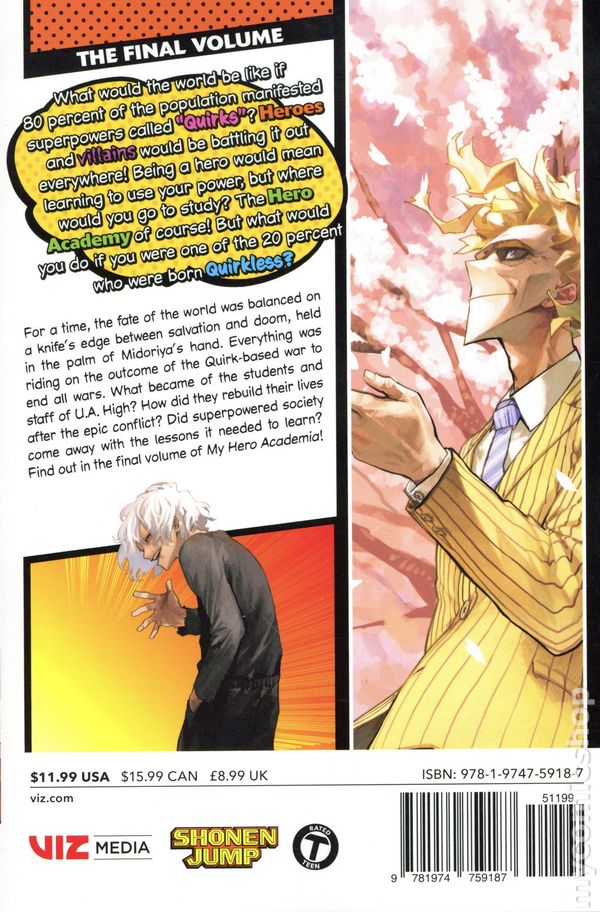 Volume 42 - 1st printing. Story and art by Kouhei Horikoshi. Translated by Caleb Cook. For a time, the fate of the world was balanced on a knife's edge between salvation and doom, held in the palm of Izuku Midoriya's hand. Everything was riding on the outcome of the Quirk-based war to end all wars. What became of the students and staff of U.A. High? How did they rebuild their lives after the epic conflict? Did superpowered society come away with the lessons it needed to learn? Find out in the final volume of My Hero Academia! Softcover, 5-in. x 7-in., 184 pages, B&W. Teen Cover price $11.99.