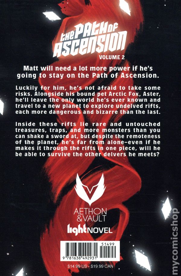 Volume 2 - 1st printing. Written by C Mantis. Art and cover by Karla Diaz. Matt will need a lot more power if hes going to stay on the Path of Ascension. Luckily for him, hes not afraid to take some risks. Alongside his bound pet Arctic Fox, Aster, hell leave the only world hes ever known and travel to a new planet to explore never-before-delved rifts, each more dangerous and bizarre than the last. Inside these rifts lie rare and untouched treasures, traps, and more monsters than you can shake a sword at, but despite the remoteness of the planet, hes far from alone–even if he makes it through the rifts in one piece, will he be able to survive the other delvers he meets? Softcover, 5-in. x 7-in., 256 pages, Text (with B&W Chapter Illustrations). Cover price $14.99.
