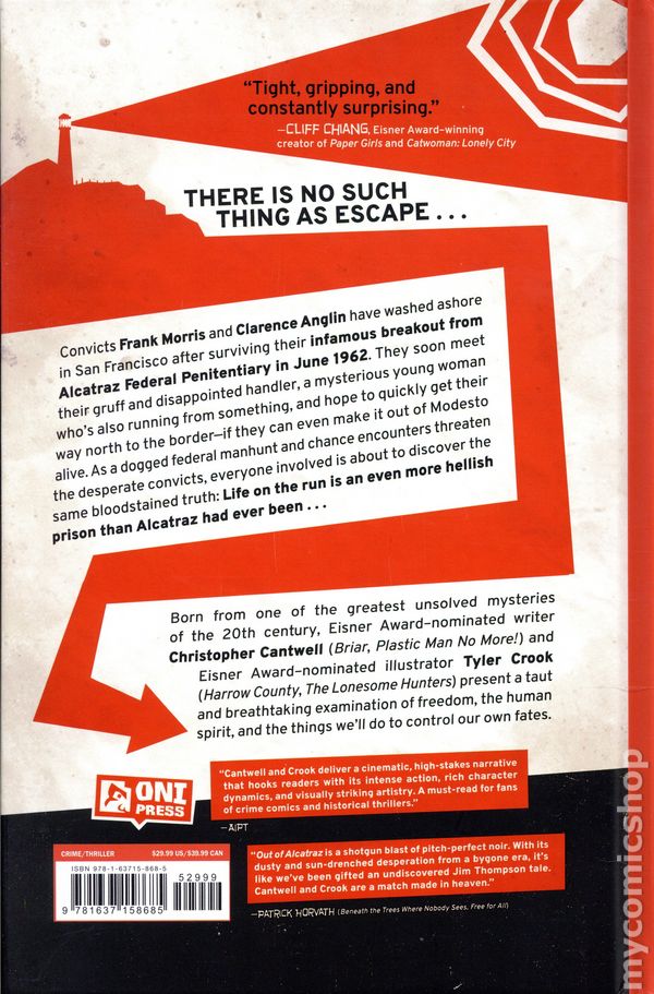 1st printing. Collects Out of Alcatraz (2025 Oni Press) #1-5. Written by Christopher Cantwell. Art and Cover by Tyler Crook. Born from one of the greatest unsolved mysteries of the 20th century, Eisner Award–nominated writer Christopher Cantwell (Plastic Man No More, Briar) and Eisner Award–nominated illustrator Tyler Crook (Harrow County, The Lonesome Hunters) present the years most taut and breathtaking graphic novel event . . . Convicts Frank Morris and Clarence Anglin have washed ashore in San Francisco after surviving their infamous escape from Alcatraz Federal Penitentiary in June 1962. They soon meet their gruff and disappointed handler, a mysterious young woman whos also running from something, and hope to quickly get their way north to the border—if they can even make it out of Modesto alive. As a dogged federal manhunt and chance encounters threaten the desperate convicts, everyone involved is about to discover the same bloodstained truth: Life on the run is an even more hellish prison than Alcatraz ever was . . . Hardcover, 176 pages, full color. Teen+ Cover price $29.99.
