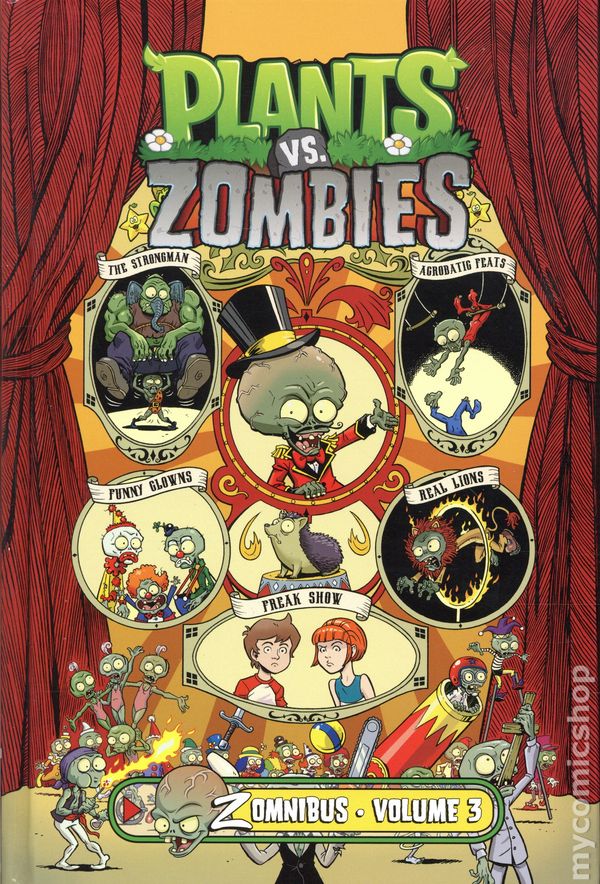 Volume 3 - 1st printing. Collects Plants vs. Zombies: Battle Extravagonzo TPB (2017 Dark Horse), Plants vs. Zombies:Lawn of Doom TPB (2017 Dark Horse), and Plants vs. Zombies: The Greatest Show Unearthed HC (2018 Dark Horse). Written by Paul Tobin. Art by Tim Lattie, Ran Chan, and Jacob Chabot. Cover by Jacob Chabot. This Zomnibus collects three humorous adventures from the award-winning Plants vs. Zombies comics series! In Zombosss latest Zomnibus collection, Crazy Dave and Zomboss clash when they both have their eye on the same factory up for sale in Battle Extravagonzo! Then there more tricks than treats when Zomboss tries to rebrand Halloween as the much scarier Lawn of Doom celebration—complete with hungry zombies and plenty of traps! Finally, when Zomboss discovers that humans like to run away and join circuses, he creates his own circus to lure Neighborville citizens to their doom in The Greatest Show Unearthed! Written by the brilliantly clever Paul Tobin and featuring gorgeous artwork by talented artists Tim Lattie, Ron Chan, and Jacob Chabot. Hardcover, 6-in.x 9-in., 248 pages, full color. Cover price $19.99.