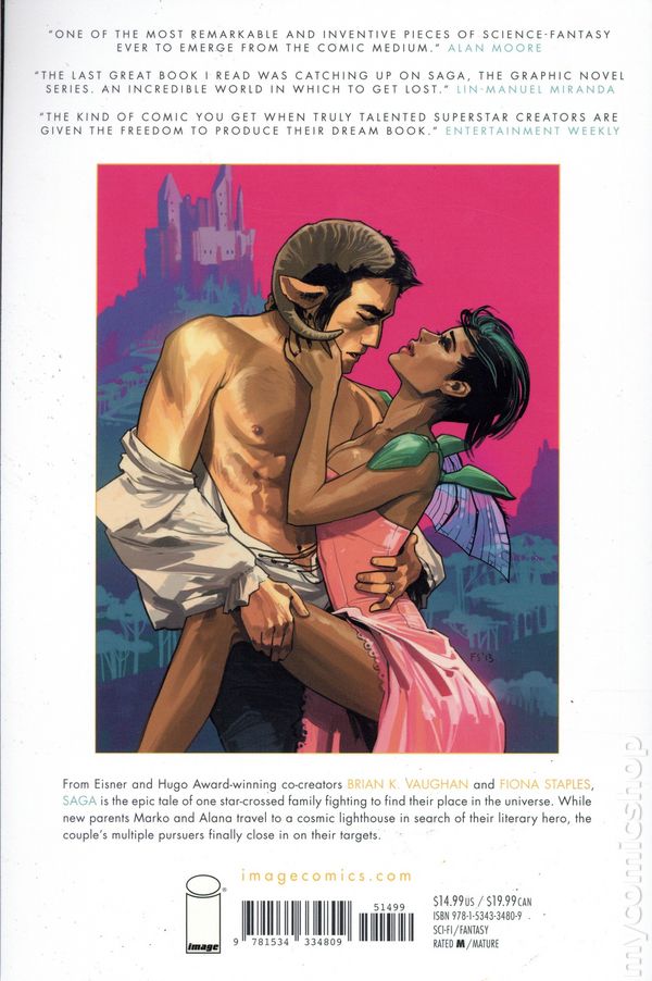 Volume 3 - 1st printing. Collects Saga (2012 Image) #13-18. Written by Brian K. Vaughan. Art and Cover by Fiona Staples. The critically acclaimed masterpiece and one of the most iconic, best selling comic book series of its time continues in the third volume, now presented in a smaller, digest size featuring all new cover art by Fiona Staples. When two soldiers from opposite sides of a never-ending galactic war fall in love, they risk everything to bring a fragile new life into a dangerous old universe. From New York Times bestselling writer Brian K. Vaughan (Y: The Last Man, Ex Machina) and critically acclaimed artist Fiona Staples (Mystery Society, North 40), Saga is the sweeping tale of one young family fighting to find their place in the worlds. Fantasy and science fiction are wed like never before in this sexy, subversive drama for adults. In volume 3, as new parents Marko and Alana travel to an alien world to visit their hero, the family's pursuers finally close in on their targets. Softcover, 6-in. x 9-in., 144 pages, full color. Mature Readers Cover price $14.99.