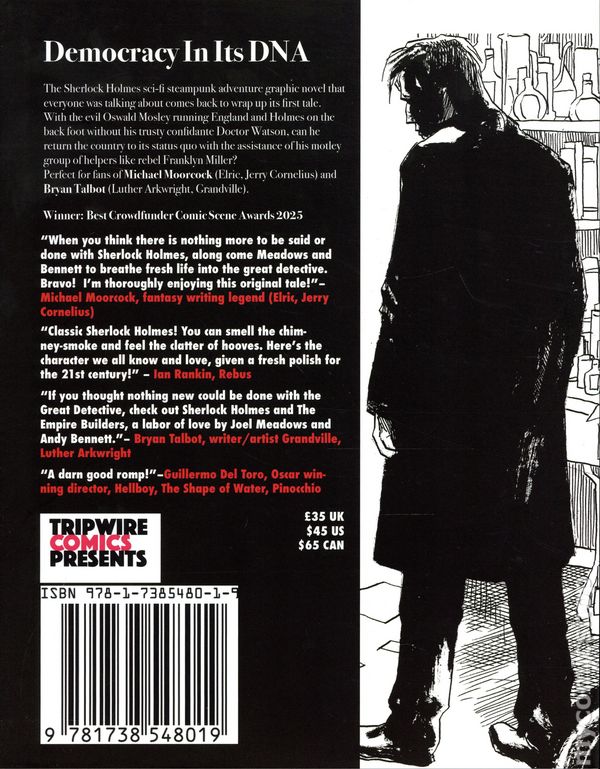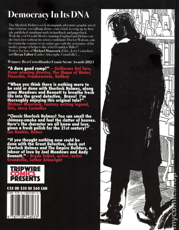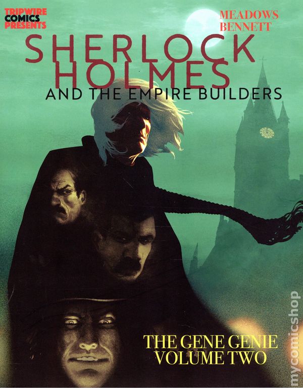 Volume 2 - 1st printing. Written by Joel Meadows. Art by Andy Bennett. Cover by Dan Panosian. The Sherlock Holmes sci fi steampunk adventure graphic novel returns to wrap up its first tale. With the evil Oswald Mosley running England and Holmes on the back foot without his trusty confidante Doctor Watson, can he return the country to its status quo with the assistance of his motley group of helpers like rebel Franklyn Miller? Features an 8-page color section with pin-ups from George Pratt, John K. Snyder III, Barry Kitson, and Tomm Coker, this concludes the first epic story of Sherlock Holmes and The Empire Builders. Softcover, 120 pages, B&W. Teen Cover price $35.00.