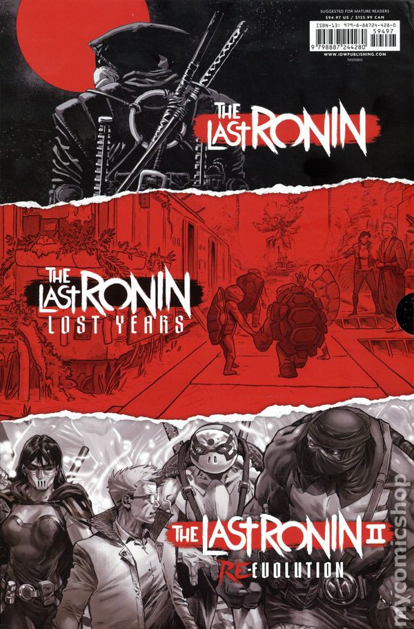 Set Includes 3 Volumes (with Slipcase) - Printings May Vary. Written by Kevin Eastman, Peter Laird, and Tom Waltz. Art by Isaac Escorza and Esau Escorza. Collect the first three series in one convenient box set! A New York Times Bestseller, The Last Ronin has exploded on the scene, becoming a must read for any comic book and graphic novel fan! The Last Ronin was the second most sold adult graphic novel in 2024 and this box set is the perfect way to catch up on the TMNT story that everyone is talking about! It contains the original series The Last Ronin, the prequel series Lost Years, and the follow up series Last Ronin II: Re-Evolution. From the notes of legendary TMNT co-creators Kevin Eastman and Peter Laird, get ready for the final story of the Teenage Mutant Ninja Turtles three decades in the making! In a future, battle-ravaged New York City, a lone surviving Turtle embarks on a seemingly hopeless mission seeking justice for the family he lost. What terrible events destroyed his family and left New York a crumbling, post-apocalyptic nightmare? In Lost Years, secrets about the Last Ronins final battle come to light—while a new generation of Teenage Mutant Ninja Turtles comes to life! Then in Re-Evolution, return to the gritty future of The Last Ronin 10 years later to see what new heroes will grow from the ashes of the TMNT legacy. More than two million Teenage Mutant Ninja Turtles comics have been sold in 2024! Experience the TMNT like never before. Hardcover (3 Volumes with Slipcase), 664 pages (Total), full color. Mature Readers