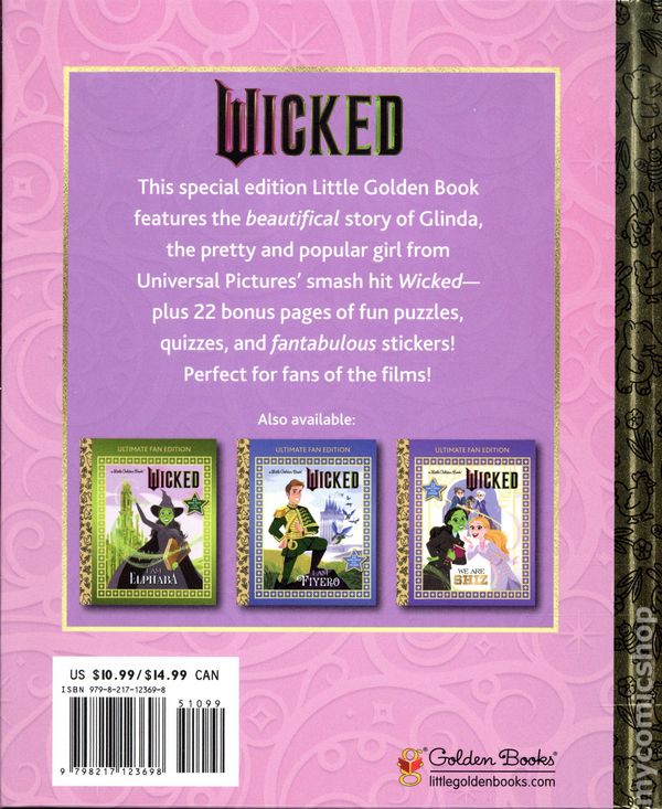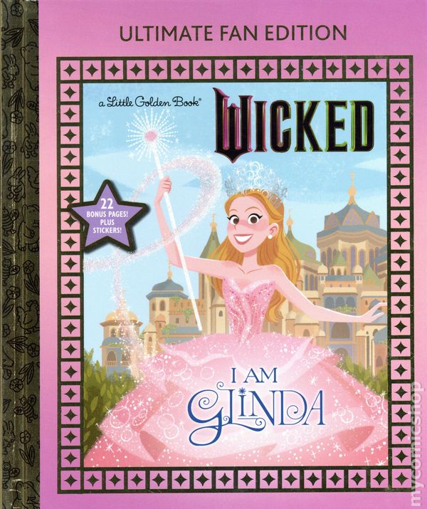 1st printing. Written by Mary Man-Kong. Art and cover by Elsa Chang. A NEW YORK TIMES BESTSELLER • Glinda from Universal Pictures blockbuster film Wicked stars in this Ultimate Fan Edition Little Golden Book! Includes 22 additional pages of Wicked quizzes, activities, a sheet of stickers, and sparkling glitter and foil on the cover—perfect for Wicked fans of all ages! This Ultimate Fan Edition Little Golden Book celebrates all that is thrillifying about Glinda, the pretty and charming girl from Universal Pictures smash-hit Wicked! Everything from Glindas magical world, including her friend Elphaba and the Wizard himself, is featured in gorgeous retro-style illustrations that will delight young children, Wicked fans, and collectors of all ages! This deluxe edition of the bestselling Little Golden Book includes 22 additional pages of Wicked quizzes, coloring pages, activities, a sheet of stickers, and sparkling glitter and foil on the cover! Little Golden Books enjoy nearly 100% consumer recognition. They feature beloved classics, hot licenses, and new original stories . . . the classics of tomorrow. Hardcover, 6 1/2-in.x 8-in., 48 pages, full color. All Ages Cover price $5.99.