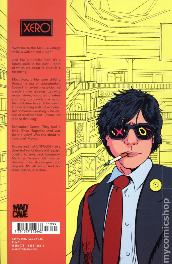 1st printing. Written by Vaho. Art and cover by Felipe Flores. Welcome to the Mall – a vintage valhalla with no end in sight. And like our titular hero, its a future stuck in the past – both of which are about to erupt in a reckoning. Meet Xero, a hip loner drifting through a sea of consumption. Soaked in sweet nostalgia, he wanders dim arcades, glowing record stores, forgotten theaters and tasty food courts – living for the next item to catch his eye in a never-ending aisle of wonders. But someones missing – he can sort of recall who but...damn, has it been that long? Remember Donna. They had a time. Once. Together. And was there a baby? Was she about to have one? Maybe. Buy me and it all UNFOLDS – to a deserted world above with a past, coming to take back tomorrow. Magic vs. Science. Demons vs. Humans. The Apocalypse and Beyond. Its all here. And for some reason, so is Xero. Softcover, 136 pages, full color. Teen+ Cover price $19.99.