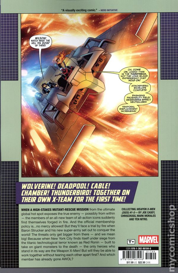1st printing. Collects Weapon X-Men (2025 Marvel) #1-5. Written by Joe Casey. Art by ChrisCross and Mark Morales. Cover by Alex Ross. Back Cover by ChrisCross and Mark Morales. Wolverine, Deadpool, Cable, Chamber, and Thunderbird come together to form the most ruthless team of mutant anti-heroes the Marvel Universe has ever seen! When a high-stakes mutant-rescue mission from the ultimate global hot spot exposes the true enemy — possibly from within — the members of an all-new team of all-action icons suddenly find themselves forged in fire. And the official membership policy is...no mercy allowed! But theyll face a trial by fire when Baron Strucker and his new super-army set out to conquer the world! The threats only get bigger from there — and we mean big! Because when New York City finds itself under siege from the titanic technological terror known as Red Ronin — built to take on giant monsters to the death — the only heroes who stand in its way are the Weapon X-Men! But will they be able to work together without tearing each other apart first? And which member has already gone AWOL? Softcover, 120 pages, full color. Rated T+ Cover price $17.99.