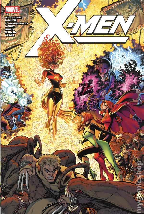 1st printing. Collects Young X-Men (2008) #1-12, X-Men (2013-2015 3rd Series) #18-22, X-Tinction Agenda (2015) #1-4, X-Men Prime (2017), X-Men Gold (2017) #1-36, X-Men Gold (2017) Annual #1, X-Men Blue (2017 Marvel) #13-15, X-Men Wedding Special (2018), and X-Men: Days of Future Past - Doomsday (2023 Marvel). Written by Marc Guggenheim Greg Pack, Cullen Bunn, Leah Williams, Monty Nero, Chris Claremont, and Kelly Thompson. Art by Ray Snyder, Kris Justice, Ben Oliver, Rafa Sandoval, Roger Bonet, Roger Martinez, Greg Adams, Yanick Paquette, Serge LaPointe, Eric Koda, Danny Miki, Harvey Tolibao, Dexter Soy, Craig Yeung, Ed Tadeo, Scott Hanna, Norman Lee, Carmine Giandomenico, Ken Lashley, Ibraim Roberson, Leonard Kirk, Guillermo Ortego, Ardian Syaf, Jay Leisten, R. B. Silva, Adriano Di Benedetto, Lan Medina, Luke Ross, Mike Mayhew, Marc Laming, Diego Bernard, JP Mayer, Thony Silas, Paulo Siqueira, Jose Luis Soares, Cam Smith, Victor Olazaba, Michele Bandini, Geraldo Borges, David Marquez, Pere Perez, Simone Buonfantino, Giovanni Valletta, Jorge Molina, Alitha Martinez,Djibril Morissette-Phan, Todd Nauck, Greg Land, Marika Cresta, and Manuel Garcia. Cover by Ken Lashley. Back Cover by Diego Bernard. Television-writing veteran Marc Guggenheim works his magic on the X-Men! From the teen mutants of YOUNG X-MEN to the A-list stars of X-MEN GOLD to the heroes of alternate presents and futures, Marc Guggenheim knows how to write the Children of the Atom! Now his various runs are collected in a single volume! In a dark time for Homo superior, Rockslide, Blindfold and Dust are alone and directionless - until Cyclops recruits them to hunt the new incarnation of the Brotherhood along with some more young mutants! On the Battleworld of SECRET WARS, the fight is on to save Genosha from X-Tinction! Kitty Pryde returns to the fold to lead the X-Men into a golden future - with Storm, Colossus, Nightcrawler, Rachel Grey and Old Man Logan by her side! But will two of them finally get married after years of will they/won't they?! Plus: Discover how the dystopian world of the classic Days of Future Past came to be and see how some of your favorite X-Men met their doom! Hardcover, 8 1/2-in. x 11-in., 1,552 pages, full color. Rated T+ Cover price $150.00.