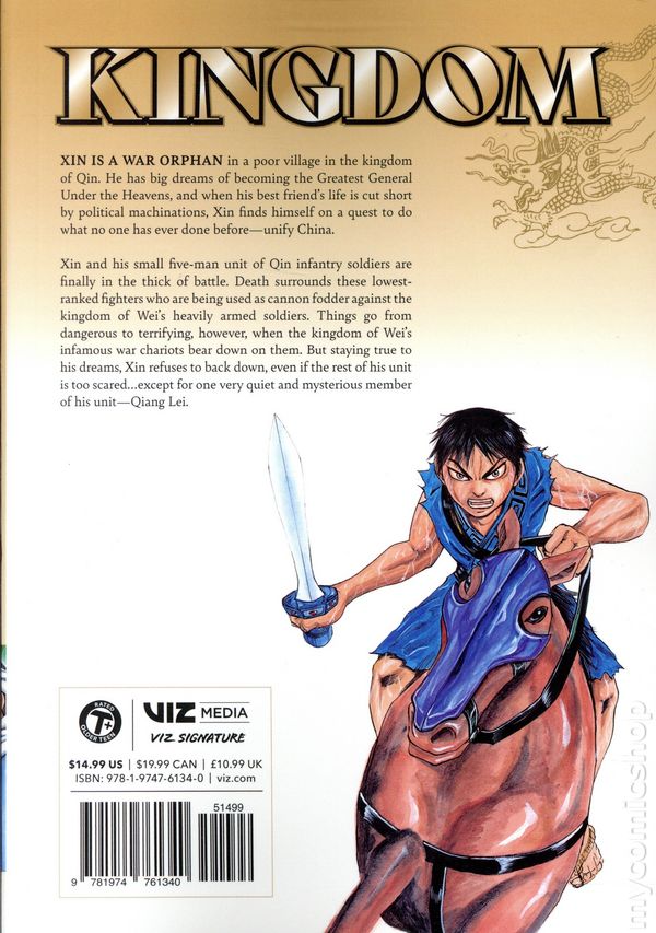Volume 6 - 1st printing. Story and art by Yasuhisa Hara. Translated by Nathan A. Collins. Xin and his small five-man unit of Qin infantry soldiers are finally in the thick of battle. Death surrounds these lowest-ranked fighters who are being used as cannon fodder against the kingdom of Weis heavily armed soldiers. Things go from dangerous to terrifying, however, when the kingdom of Weis infamous war chariots bear down on them. But staying true to his dreams, Xin refuses to back down, even if the rest of his unit is too scared…except for one very quiet and mysterious member of his unit—Qiang Lei. Softcover, 5-in. x 7-in., 216 pages, B&W. Teen Cover price $14.99.