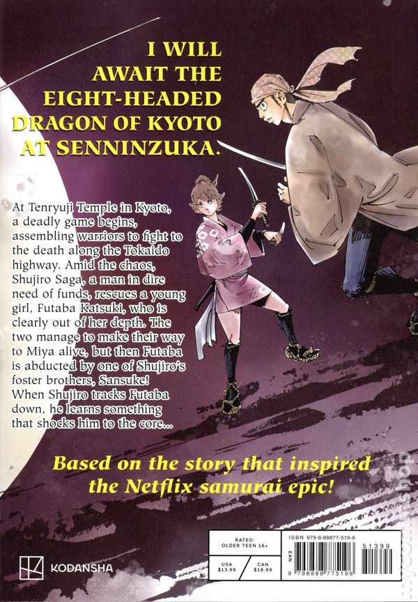 Volume 4 - 1st printing. Based on the Novel Series by Shogo Imamura. Art and cover by TATSUZ. Translated by Matt Treyvaud. Based on the story that inspired the Netflix samurai epic! As the 19th century comes to a bloody end, a sinister game of life-or-death brutally culls Japans fading warrior class. Who is rounding up the few who still cling to their swords and forcing them to fight? Who will be the last samurai standing? The year 1878--the 11th year of the Meiji era in Japan, and more than a decade since the samurai were stripped of their privileges and swords outlawed on public streets. A mysterious flyer appears in all corners of the land, luring those skilled in martial arts to Kyoto with the promise of riches beyond common imagination. As warriors deprived of purpose flock to the appointed place at the appointed time, what awaits them is no ordinary task, but an all-out war--against each other! Softcover, 5-in. x 7-in., 192 pages, B&W. Older Teen 16+ Cover price $13.99.