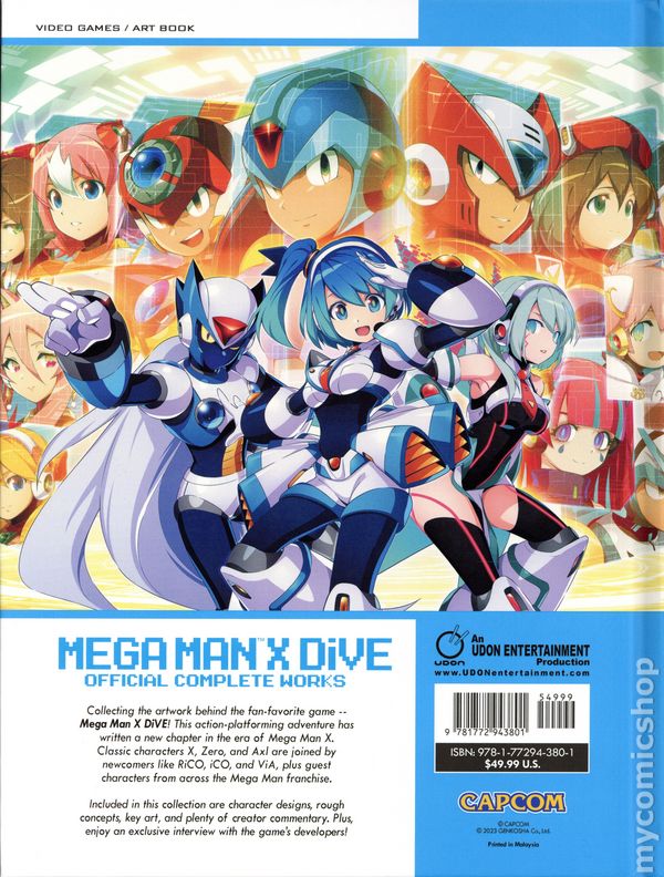 1st printing. Collecting the artwork behind the fan-favorite game -- Mega Man X DiVE! This action-platforming adventure has written a new chapter in the era of Mega Man X. Classic characters X, Zero, and Axl are joined by newcomers like RiCO, iCO, and ViA, plus guest characters from across the Mega Man franchise. Included in this collection are character designs, rough concepts, key art, and plenty of creator commentary. Plus, enjoy an exclusive interview with the games developers! Hardcover, 8-in. x 11-in., 256 pages, full color. Cover price $49.99.