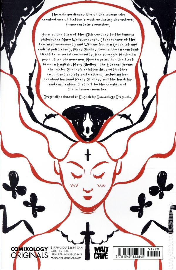 1st printing. Written by Alessandro Di Virgilio. Art and cover by Manuela Santoni. The extraordinary life of the woman who created one of fiction's most enduring characters: Frankenstein's monster. Born at the turn of the 19th century to the famous philosopher Mary Wollstonecraft (forerunner of the feminist movement) and William Godwin (novelist and radical politician), Mary Shelley lived a life in constant flight from social conformity. Her struggle birthed a pop culture phenomenon. Now in print for the first time in English, Mary Shelley: The Eternal Dream chronicles Shelley's relationships with other important artists and writers, including her eventual husband Percy Shelley, and the "butterfly effect" of love, hardship, tragedy, and inspiration that led to the creation of the infamous monster. Softcover, 136 pages, B&W (and Red). Teen+ Cover price $19.99.