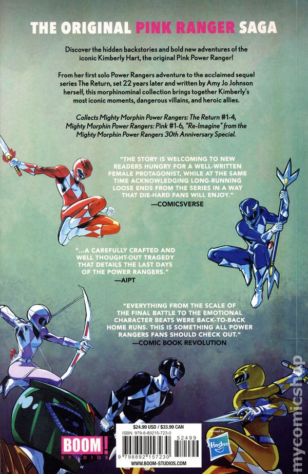 1st printing. Collects Mighty Morphin Power Rangers: The Return (2024 Boom) #1-4, Mighty Morphin Power Rangers: Pink (2016) #1-6, and material from Mighty Morphin Power Rangers 30th Anniversary Special (2023 Boom). Written by Brendan Fletcher, Kelly Thompson, Tini Howard, Amy Jo Johnson, and Matt Hotson. Art by Daniele Di Nicuolo and Nico Leon. Cover by Jenny Frison. Two unforgettable adventures. One legendary Ranger. The Pink Ranger takes center stage in this exciting collection spanning past, present...and alternate timelines! Kimberly Harts journey as the original Mighty Morphin Pink Ranger has always stood apart—and now, for the first time, two of her most daring solo adventures are brought together in one essential volume! In Mighty Morphin Power Rangers: Pink, after stepping away from the Ranger mantle, Kimberly is pulled back into action when a mysterious threat endangers her loved ones and an innocent village. With her parents missing and time running out, she must reconnect with the Grid once more to save the day in this riveting take from writers Brenden Fletcher and Kelly Thompson and artist Daniele Di Nicuolo. Then, in Mighty Morphin Power Rangers: The Return, decades have passed, the team has fractured, and Kimberly finds herself confronting the aftermath of the Rangers' greatest battle—and a request that may reunite old friends for one last mission that will change everything. Written by Power Rangers legend Amy Jo Johnson, along with co-writer Mat Hotson and artist Nico Leon, this bold reimagining adds new layers to Kimberlys fan-favorite legacy! Softcover, 304 pages, full color. Rated T+ Cover price $24.99.