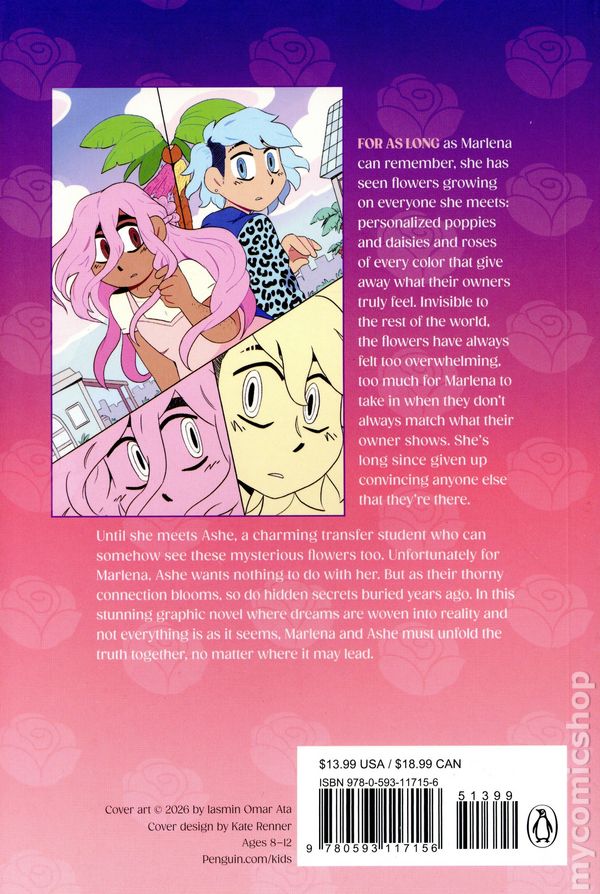 1st printing. Story and art by Iasmin Omar Ata. From the author of the critically acclaimed Nayra and the Djinn comes a stunning graphic novel about a girl who must uncover the truth behind her strange visions. For as long as Marlena can remember, she has seen flowers growing on everyone she meets: personalized poppies and daisies and roses of every color that give away what their owners truly feel. Invisible to the rest of the world, the flowers have always felt too overwhelming, too much for Marlena to take in when they don't always match what their owner shows. She's long since given up convincing anyone else that they're there. Until she meets Ashe, a charming transfer student who can somehow see these mysterious flowers, too. Unfortunately for Marlena, Ashe wants nothing to do with her. But as their thorny connection blooms, so do hidden secrets buried years ago. In this stunning graphic novel where dreams are woven into reality and not everything is as it seems, Marlena and Ashe must unfold the truth together, no matter where it may lead. Softcover, 5 1/2-in.x 8-in., 256 pages, full color. Age 8-12 years Cover price $13.99.