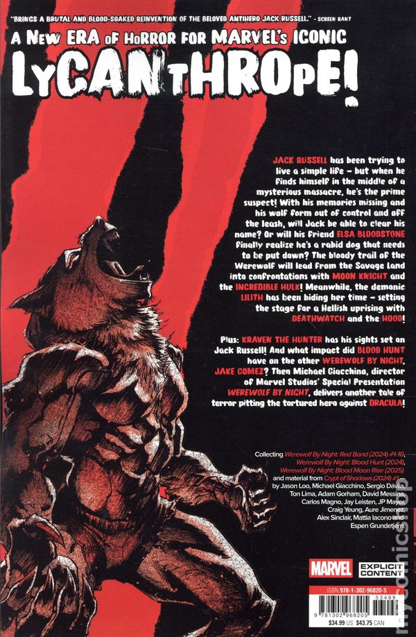 1st printing. Collects Werewolf by Night: Red Band (2024 Marvel) #1-10, Werewolf by Night: Blood Hunt (2024 Marvel), Werewolf by Night: Blood Moon Rise (2025 Marvel), and a Story from Crypt of Shadows (2024 Marvel). Written by Jason Loo and Michael Giacchino. Art by Sergio Dávila, Ton Lima, Jay Leisten, Aure Jimenez, JP Mayer, Craig Yeung, Adam Gorham, Carlos Magno, David Messina, and Jason Loo. Cover by E.M. Gist. A new era of horror for Marvels iconic lycanthrope! Featuring a brand-new story written by Michael Giacchino, director of the Marvel Studios Disney+ special Werewolf by Night and composer of the upcoming Fantastic Four: First Steps. Jack Russell has been trying to live a simple life — but when he finds himself in the middle of a mysterious massacre, hes the prime suspect! With his memories missing and his wolf form out of control and off the leash, will Jack be able to clear his name? Or will his friend Elsa Bloodstone finally realize hes a rabid dog that needs to be put down? The bloody trail of the Werewolf will lead from the Savage Land into confrontations with Moon Knight and the Incredible Hulk! Meanwhile, the demonic Lilith has been biding her time — setting the stage for a Hellish uprising with Deathwatch, the Hood and a Werewolf by Night at its fore! But which Werewolf by Night? And something is stirring within the lycanthropes of the Marvel Universe — and as they go for one anothers throats, the civilians will be caught in the claws-fire! Plus: What impact did BLOOD HUNT have on the other Werewolf by Night, Jake Gomez? And Michael Giacchino, director of Marvel Studios Special Presentation WEREWOLF BY NIGHT, delivers another tale of terror pitting the tortured hero against Dracula! Softcover, 296 pages, full color. Mature Readers Cover price $34.99.