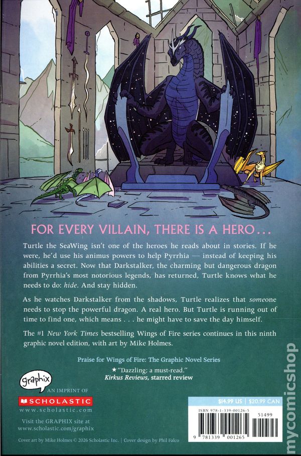 Volume 9 - 1st printing. "Talons of Power!" Based on the story by Tui T Sutherland. Adapted by Barry Deutsch and Rachel Swirsky. Art and cover by Mike Holmes. The graphic novel adaptations of the #1 New York Times bestselling Wings of Fire series continue to set the world on fire! For every villain, there is a hero ... Turtle isnt one of the heroes he reads about in stories. If he were, hed use his animus powers to help Pyrrhia -- instead of keeping his abilities a secret, even from his own sister. Now that Darkstalker, the sinister and impossibly old dragon from Pyrrhias most notorious legends, has returned, Turtle knows his own role is simple: hide. And stay hidden. The more he watches Darkstalker from the shadows, the more Turtle knows that someone needs to stop the powerful dragon. A real hero. But Turtle is running out of time to find one, which means ... he might have to try to save the day himself. The #1 New York Times bestselling Wings of Fire series soars to new heights in the ninth graphic novel adaptation, with art by Mike Holmes. Softcover, 6-in. x 9-in., 240 pages, full color. Cover price $14.99.