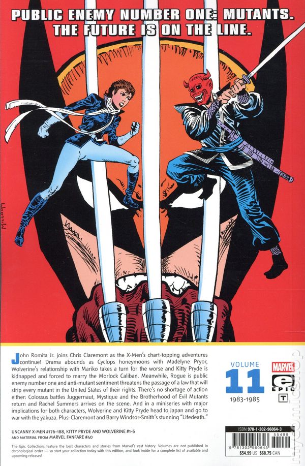 1st printing. Collects The Uncanny X-Men (1963-2011 1st Series) #176-188, Kitty Pryde and Wolverine (1984) #1-6 and material from Marvel Fanfare (1982-1992 1st Series) #40. Written by Chris Claremont and Barry Windsor-Smith. Art by John Romita, Jr., Al Milgrom, Barry Windsor-Smith, Craig Hamilton, Dan Green, Bob Wiacek, Terry Austin, Rick Bryant, Brett Breeding, and John Romita, Sr. Cover by John Romita, Jr. and Dan Green. Back Cover by Al Milgrom. Chris Claremont's decades-spanning run on the X-Men continues, now joined by artistic legend John Roimita Jr.! John Romita Jr. joins Chris Claremont as the X-Mens chart-topping adventures continue! Drama abounds as Cyclops heads off on his honeymoon with Madelyne Pryor, Wolverines relationship with Mariko takes a turn for the worse and Kitty Pryde is kidnapped and forced to marry the Morlock Caliban. Meanwhile, Rogue is public enemy number one and anti-mutant sentiment threatens the passage of a law that will strip every mutant in the United States of their rights. Theres no shortage of action either: Colossus battles Juggernaut, Mystique and the Brotherhood of Evil Mutants return and Rachel Summers arrives on the scene. And in a miniseries with major implications for both characters, Wolverine and Kitty Pryde head to Japan and go to war with the yakuza. This volume is topped off by Claremont and Barry Windsor-Smiths stunning Lifedeath. Softcover, 496 pages, full color. Rated T Cover price $54.99.