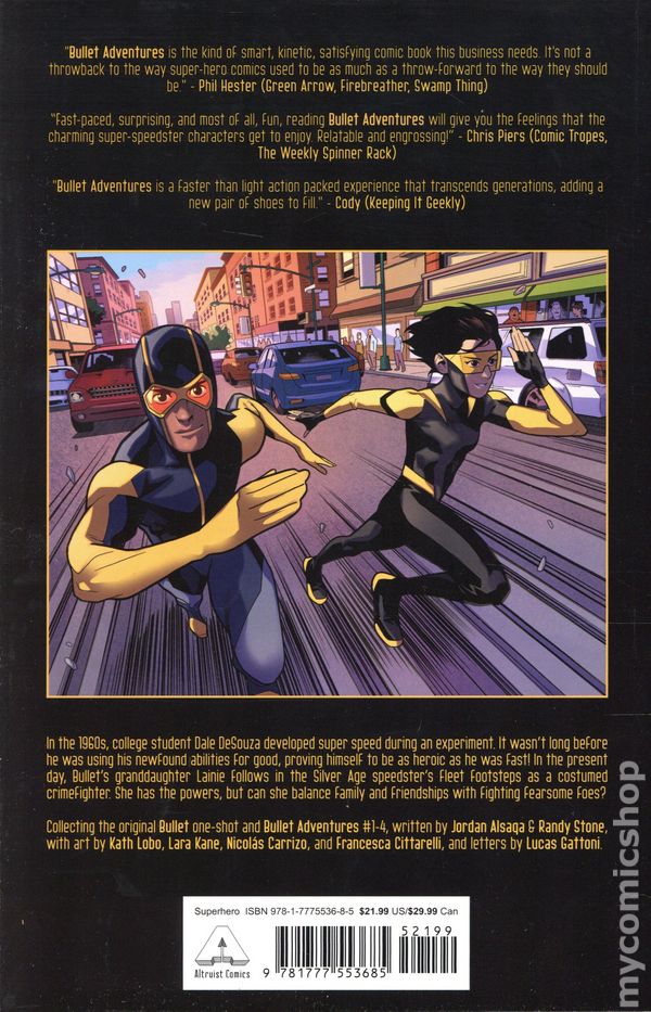 Volume 1 - 2nd and later printings. "Greatest of All Time!" Collects Bullet One-Shot and Bullet Adventures (2025 Massive) #1-4. Written by Jordan Alsaqa and Randy Stone. Art by Kath Lobo, Lara Kane, and Nicolas Carrizo. Cover by Nicolas Carrizo. Altruist Comics Presents: In the 1960s, college student Dale DeSouza developed super speed during an experiment. It wasnt long before he was using his newfound abilities for good, proving himself to be as heroic as he was fast! In the present day, Bullets granddaughter Lainie follows in the Silver Age speedsters fleet footsteps as a costumed crime fighter as well. She has the powers, but can she balance family and friendships with fighting fearsome foes? Softcover, 128 pages, full color. Teen Cover price $21.99.