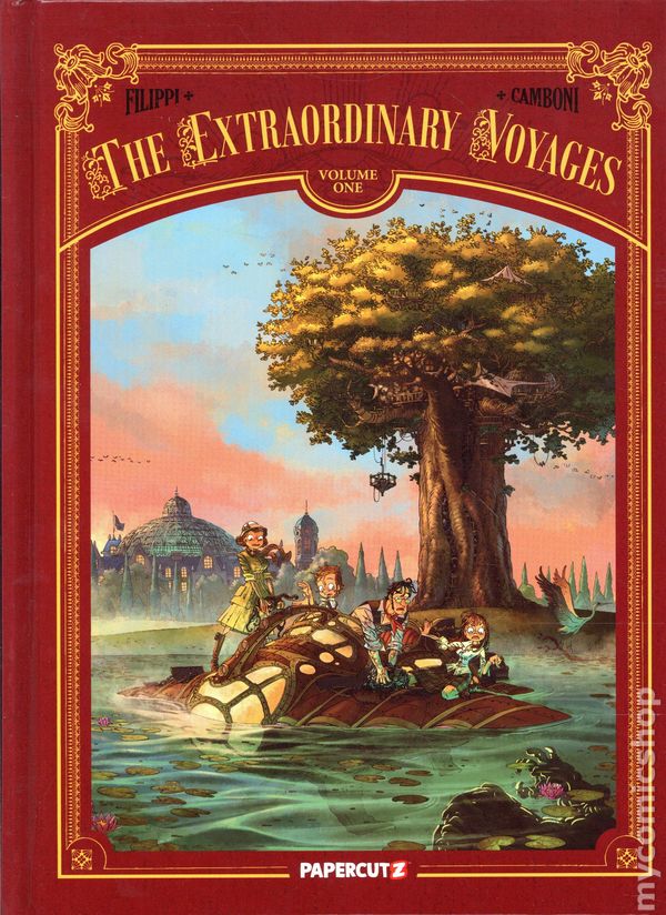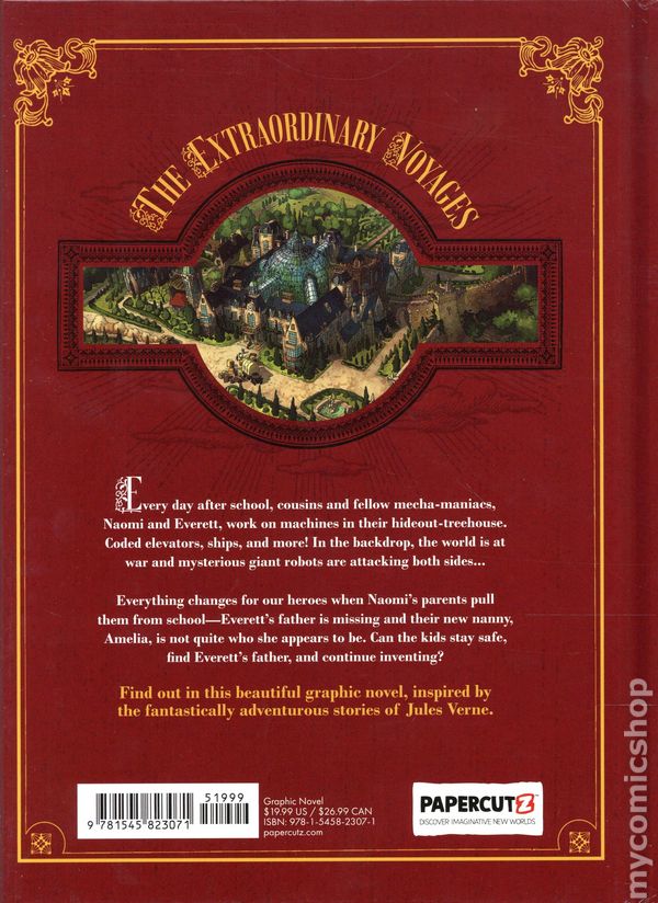 Volume 1 - 1st printing. Written by Denis-Pierre Filippi. Art and cover by Silvio Camboni. Every day after school, cousins and fellow mecha-maniacs, Naomi and Everett, work on machines in their hideout-treehouse. Coded elevators, ships, and more! In the backdrop, the world is at war and mysterious giant robots are attacking both sides... Everything changes for our heroes when Naomi's parents pull them from school--Everett's father is missing and their new nanny, Amelia, is not quite who she appears to be. Can the kids stay safe, find Everett's father, and continue inventing? Find out in this beautiful graphic novel, inspired by the fantastically adventurous stories of Jules Verne. Hardcover, 6 1/2-in.x 9-in., 144 pages, full color. Middle Grade Cover price $19.99.