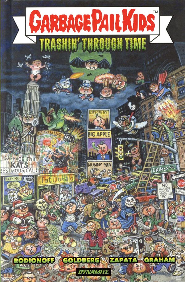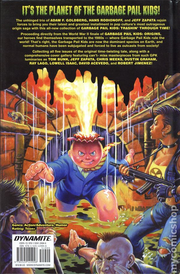 1st printing. Collects Garbage Pail Kids: Trashin' Through Time (2023 Dynamite) #1-5. Written by Hans Rodionoff, Adam F. Goldberg and Jeff Zapata. Art by Jeff Zapata. Cover by Tom Bunk. Back Cover by Ray Lago. The unhinged trio of ADAM F. GOLDBERG, HANS RODIONOFF, and JEFF ZAPATA have rejoined forces to bring you their latest and greatest installment in pop cultures most outrageous origin saga with all-new collections of Garbage Pail Kids: Trashin' Through Time! Proceeding directly from the World War II finale of their previous chapter (Garbage Pail Kids: Origins, also available for order!), our heroes find themselves transported to the 1980s — where Garbage Pail Kids rule the world! That's right, the Garbage Pail Kids are now the dominant species on Earth, and normal humans have been subjugated and forced to live as outcasts from society. Its the Planet of the Garbage Pail Kids — and we just live on it! Available in both trade paperback and hardcover editions, this time-twisting tale collects all five issues of the original series and includes a comprehensive cover gallery featuring cant-miss masterpieces from such GPK luminaries as TOM BUNK, JEFF ZAPATA, CHRIS MEEKS, DUSTIN GRAHAM, RAY LAGO, LOWELL ISAAC, DAVID ASCEVEDO, and ROBERT JIMENEZ! Hardcover, 136 pages, full color. Cover price $19.99.
