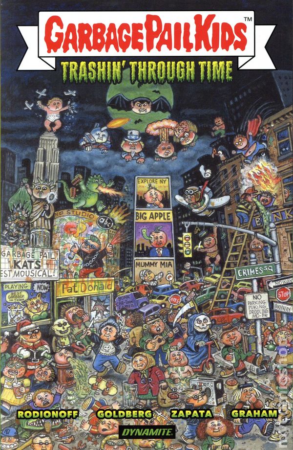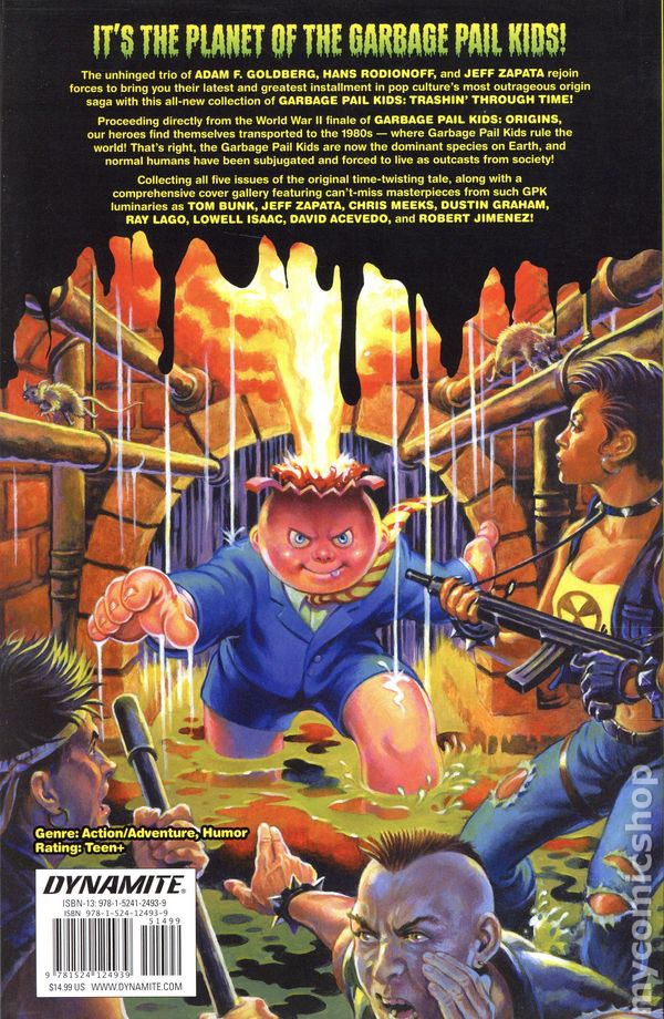 1st printing. Collects Garbage Pail Kids: Trashin' Through Time (2023 Dynamite) #1-5. Written by Hans Rodionoff, Adam F. Goldberg and Jeff Zapata. Art by Jeff Zapata. Cover by Tom Bunk. Back Cover by Ray Lago. The unhinged trio of ADAM F. GOLDBERG, HANS RODIONOFF, and JEFF ZAPATA have rejoined forces to bring you their latest and greatest installment in pop cultures most outrageous origin saga with all-new collections of Garbage Pail Kids: Trashin' Through Time! Proceeding directly from the World War II finale of their previous chapter (Garbage Pail Kids: Origins, also available for order!), our heroes find themselves transported to the 1980s — where Garbage Pail Kids rule the world! That's right, the Garbage Pail Kids are now the dominant species on Earth, and normal humans have been subjugated and forced to live as outcasts from society. Its the Planet of the Garbage Pail Kids — and we just live on it! Available in both trade paperback and hardcover editions, this time-twisting tale collects all five issues of the original series and includes a comprehensive cover gallery featuring cant-miss masterpieces from such GPK luminaries as TOM BUNK, JEFF ZAPATA, CHRIS MEEKS, DUSTIN GRAHAM, RAY LAGO, LOWELL ISAAC, DAVID ASCEVEDO, and ROBERT JIMENEZ! Softcover, 136 pages, full color. Cover price $14.99.