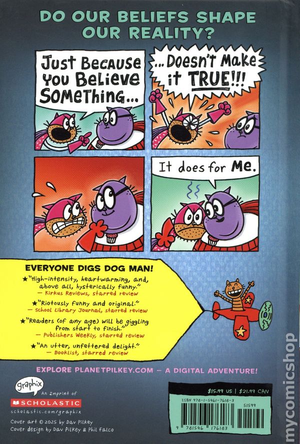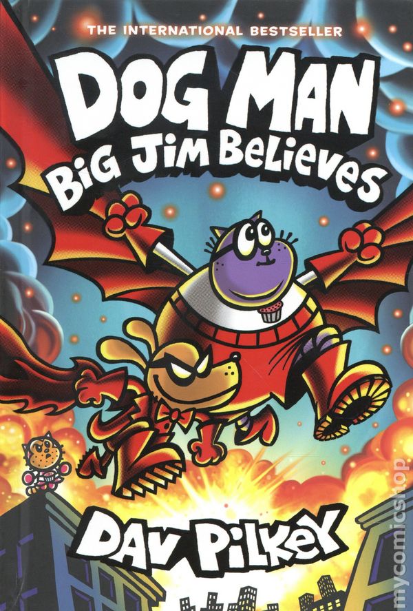 Volume 14 - 1st printing. "Big Jim Believes!" Story and art by Dav Pilkey. The celebration comes to a halt for our heroes in Dog Man: Big Jim Believes when the mischievous Space Cuties From Space return. Our caped crusaders -- Dog Man (aka Scarlet Shedder), Commander Cupcake, and Sprinkles -- along with Mecha Molly discover that the city has changed, and nothing is how it should be. Can Big Jim's positivity and innocence help our heroes? Will Dog Man, Big Jim, Grampa, and Molly have the courage to trust each other and save the day? How does the past help shape the future? And who is the chosen one? Readers will want to hold onto their hero capes as they soar into a new thrilling Dog Man story. The series follows the hilarious adventures of Dog Man, a lovable canine superhero and his friends. Each exciting graphic novel features inspiring characters, animated Flip-O-Ramas, and more! Hardcover (NO Dust Jacket), 6-in. x 9-in., 224 pages, full color. All Ages Cover price $15.99.