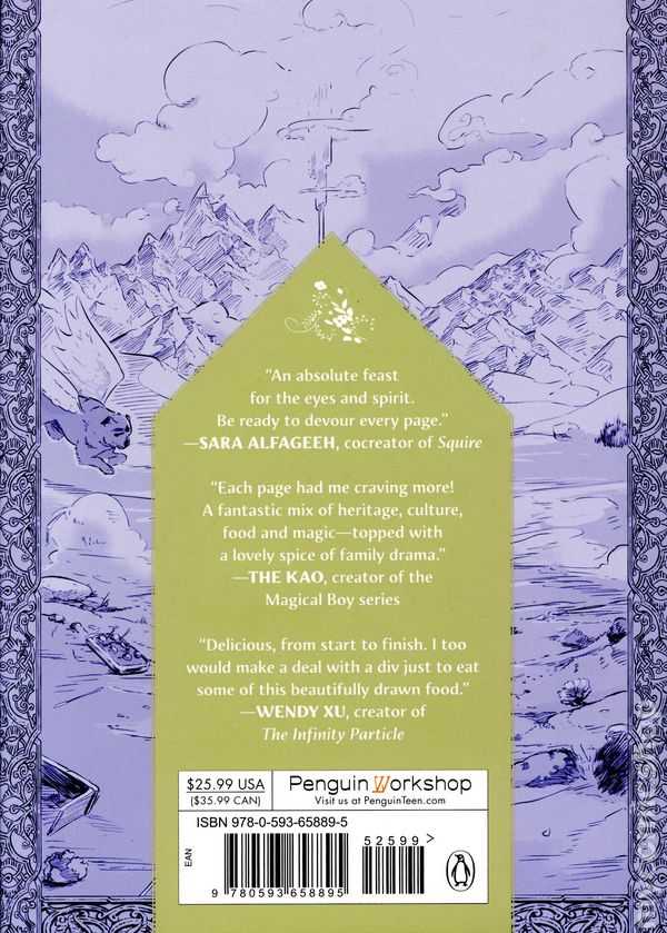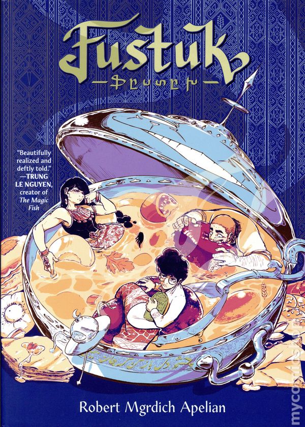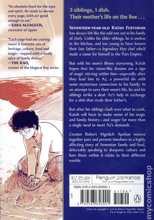 1st printing. Story and art by Robert Mgrdich Apelian. Inspired by Armenian and Persian mythology, this delectable YA graphic novel follows the youngest of three dysfunctional siblings who strike a magical deal to save their mother's life. "Beautifully realized and deftly told. Fustuk wonderfully balances the past and present, the magical and the mundane, lovingly presented in equal measure."—Trung Le Nguyen, creator of The Magic Fish. Seventeen-year-old Katah Fustukian has always felt like the odd one out in his family of chefs. Unlike his older siblings, he is useless in the kitchen, and too young to have known their late father—a legendary Hye chef whod made a name for himself in the Pars Empire. But with his moms illness worsening, Katah hopes that his vision-like dreams are a sign of magic stirring within him—especially after they lead him to Az, a powerful div with some mysterious connection to his family. In an attempt to save their moms life, he and his siblings strike a deal: Azs help in exchange for a dish that rivals their fathers. But after the siblings clash over what to cook, Katah will have to make sense of his magic and family history—and wager far more than a single meal to meet Azs demands... Creator Robert Mgrdich Apelian weaves together multiple timelines in an inventive, fantastical story of Armenian family and food, speaking to diasporic culture and how those within it relate to their different worlds. Softcover, 6-in. x 8 1/2-in., 304 pages, PC. Cover price $17.99.
