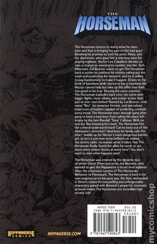 Volume 2 - 1st printing. Written by Chuck Dixon. Art by Joe Bennett and Fabio Jansen. Cover by Riccardo Cecchi. The Horseman returns to doing what he does best and that is bringing the pain to bad guys! Breaking his promise to both his sister, Patty, and the Alphacore, who gave him a one-time pass for playing vigilante, Hector Lee Caballero decides to take a chance on meeting his number one fan. Tech Billionaire, Cal Buxton, wants to get the Horseman back in action to continue his mission taking out the trash and protecting the innocent, and he is willing to pay handsomely to make it happen. Driven to the brink of boredom while forced to live a mundane life, Hector cannot help but take up this offer that feels too good to be true. Sharing the same enemies, the Horseman explodes back onto the scene with bigger fights, more villains, and crazier action than you've ever seen before! Softcover, 56 pages, full color. Rated: 16+ Cover price $34.00.