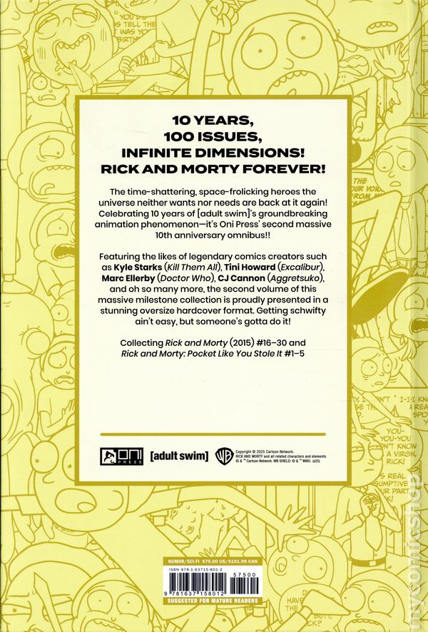 Volume 2 - 1st printing. Collects Rick and Morty (2015-2022 Oni Press) #16-30 and Rick and Morty: Pocket Like You Stole It (2017 Oni) #1-5. Written by Kyle Starks, Tini Howard, Sean Vanaman, Olly Moss. Art by Kyle Starks, CJ Cannon, Marc Ellerby , Andy Hirsch, and Benjamin Dewey. Cover by Scott Sugiuchi. The time-shattering, space-frolicking heroes the universe neither wants nor needs are back at it again! Celebrating 10 years of [adult swim]s groundbreaking animation phenomenon—its Oni Press second massive 10th anniversary omnibus!! Featuring the likes of legendary comics creators such as Kyle Starks (Kill Them All), Tini Howard (Excalibur), Marc Ellerby (Doctor Who), CJ Cannon (Aggretsuko), and oh so many more, the second volume of this massive milestone collection is proudly presented in a stunning oversize hardcover format. Getting schwifty aint easy, but someones gotta do it! Softcover, 480 pages, full color. Teen+ Cover price $75.00.