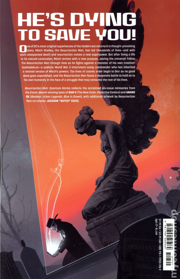1st printing. Collects Resurrection Man: Quantum Karma (2025 DC) #1-6. Written by Ram V. Art by Anand RK, Jackson Butch Guice, and Mike Perkins. Cover by Jeff Dekal. THE BUZZ-WORTHY SERIES BY EISNER AWARD-WINNING TEAM RAM V AND ANAND RK! The Resurrection Man is back, courtesy of the Eisner Award-winning team of Ram V (New Gods, Detective Comics) and Anand RK (Batman: Urban Legends, Blue in Green). Mitch Shelley has led thousands of lives--and with each death and unexpected resurrection comes a new superpower. But now Mitch revives with a new purpose...saving the universe! Follow Resurrection Man through time as he fights a monster of his own creation: a sadistic World War II internment-camp commander who has inherited a twisted version of Mitchs own powers. Softcover, 152 pages, full color. Mature Readers Cover price $17.99.