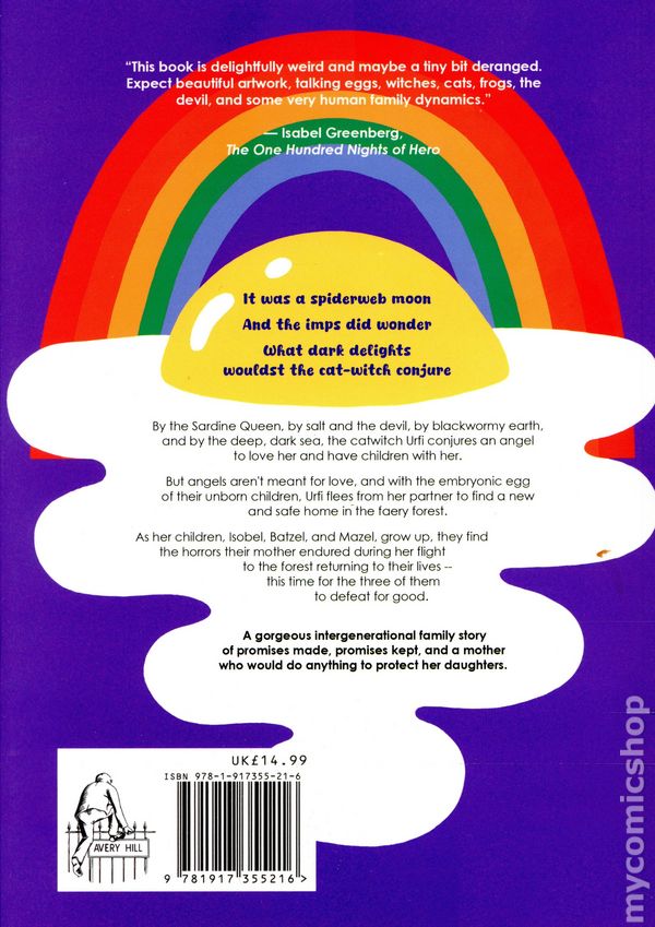 1st printing. Story and art by Donya Todd. It was a spiderweb moon And the imps did wonder What dark delights wouldst the cat-witch conjure By the Sardine Queen, by salt and the devil, by blackwor my earth, and by the deep, dark sea, the catwitch Urfi conjures an angel to love her and have children with her. But angels aren't meant for love, and with the embryonic egg of their unborn children, Urfi flees from her partner's violence, enduring terrible trials to find a new and safe home in the faery forest. As her children, Isobel, Batzel, and Mazel, grow up with her, they find the horrors their mother endured during her flight to the forest returning to their lives -- this time for the three of them to defeat for good. With secret magic, solemn bonds of friendship, and sisterhood, they can at last stand against the threat of the angels' terror and insanity in this dark fairytale of motherhood, magic, and apocalyptic romance. A gorgeous intergenerational family story of promises made, promises kept, and a mother who would do anything to protect her daughters. Softcover, 6 1/2-in. x 9- 1/2-in., 180 pages, full color. Cover price $19.99.