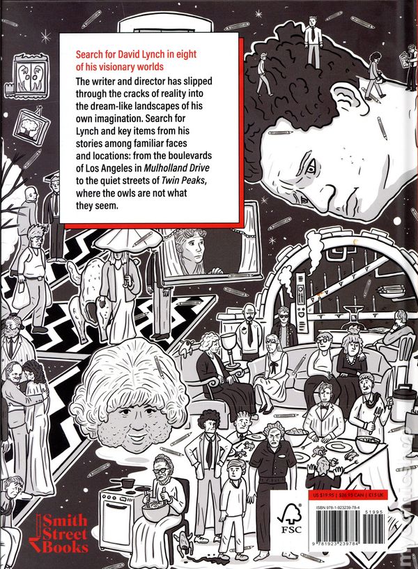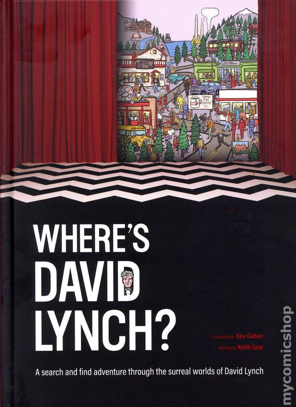 1st printing. Written by Keith Gow. Art and cover by Kev Gahan. Find David Lynch and more in eight of his iconic movie and TV worlds. Illustrated with incredible detail by British artist Kev Gahan, this book is an interactive homage to one of cinemas most unique minds: David Lynch. On each page, Lynch hides among the characters that inhabit his dreamlike cinematic worlds, ready for the eagle-eyed reader to spy him in the crowds. These illustrations capture the eerie external (and internal) landscapes of Twin Peaks, the decaying suburbia of Blue Velvet, the neo-noir anxiety of Mulholland Drive, and more! This book is bursting with super-super-fan references, and it is the ultimate gift for any David Lynch fan. Hardcover, 8-in. x 11-in., 24 pages, full color. Cover price $19.95.