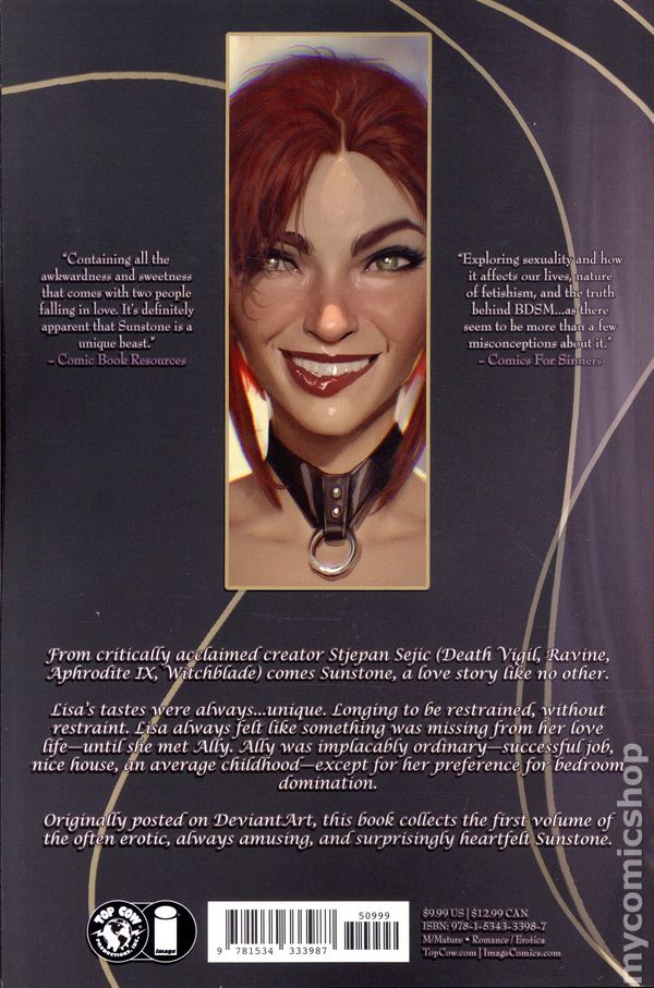 2nd Edition - Volume 1 - 1st printing. Story and art by Stjepan Sejic. A slow-burn lesbian romance with a kinky twist! From critically acclaimed creator Stjepan Šejic (Death Vigil, Ravine, Aphrodite lX, Witchblade) comes Sunstone, a love story like no other. Now presented in a 6x9 edition featuring all-new cover art by Stjepan Šejic. Lisas tastes were always...unique. Longing to be restrained, without restraint. Lisa always felt like something was missing from her love life—until she met Ally. Ally was implacably ordinary—successful job, nice house, an average childhood—except for her preference for bedroom domination. Originally posted online as a webcomic, this book collects the first volume of the often erotic, always amusing, and surprisingly heartfelt Sunstone. Softcover, 6-in. x 9-in., 128 pages, full color. Mature Readers Cover price $9.99.