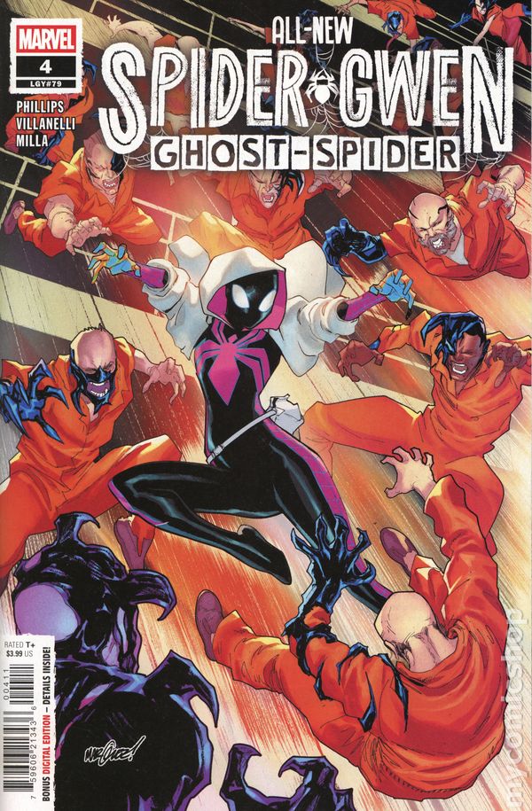 (W) Stephanie Phillips (A) Paolo Villanelli (CA) Inhyuk Lee PANIC! AT THE PRISON! Tantrum has taken over Ryker's Island, creating an army of symbiote-d prisoners, and government soldiers are at the doors! Can Gwen stop Tantrum before the military levels Ryker's to the ground? 32 pages, full color, rated teen+. Cover price $3.99.