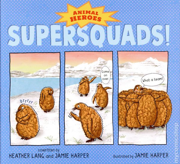 1st printing. Written by Heather Lang and Jamie Harper. Art and cover by Jamie Harper. Theres strength in numbers out there in the wild! In a lively comics-style format, the creators of Supermoms! and Superdads! deliver a funny, fascinating look at some ingenious ways that animal squads survive. Did you know that when honeybees find a food source, they do a dance to convey the direction, distance, and yumminess level to their hive mates? Or that chickadees add extra dees to their calls to warn their flock of danger? Or that a meerkat standing like a sentry may well be guarding its mob while they eat? Sometimes the key is divvying up tasks, like when beavers build a dam, or its combining differences—like when a sea anemone protects a hermit crab with its stinging tentacles, then gets a ride and some tasty tidbits from the crab. Or its power in numbers, as when hundreds of thousands of starlings fly in a murmuration, foiling predators trying to lock in on a target. With fun, fact-filled panels, Heather Lang and Jamie Harper delve into the ways animals band together to stay safe and thrive, from orcas to ostriches, spiny lobsters to snow monkeys, leaf cutter ants to zebras and more. Aspiring naturalists can find out more about the animals in the back matter, along with an array of resources for continuing to explore. Hardcover, 11 1/2-in. x 10 1/4-in., 40 pages, full color. All Ages Cover price $18.99.