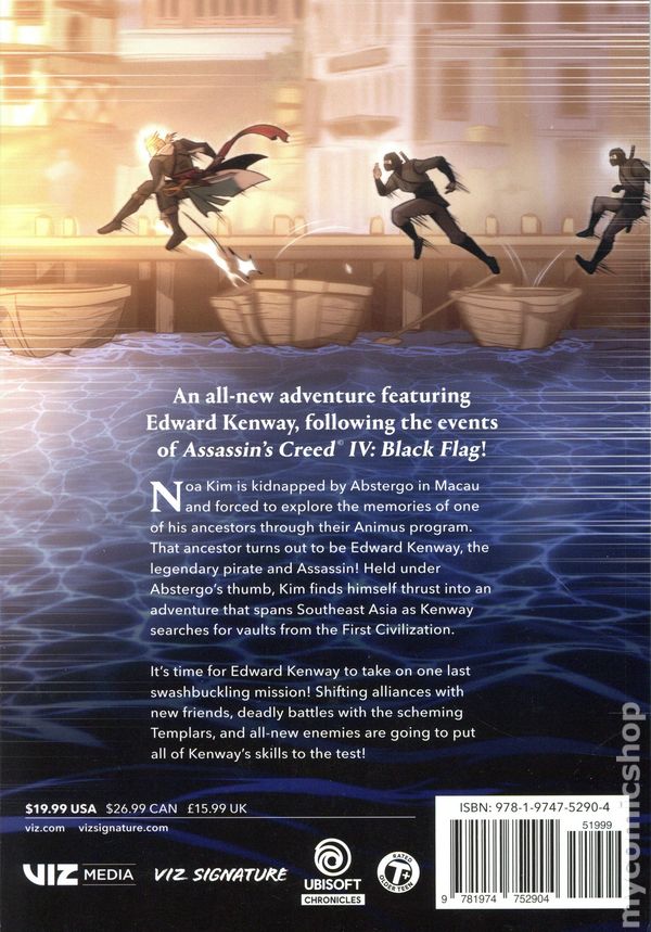 Volume 1 - 1st printing. Written by ARC. Art and cover by Tabii. Translated by Amy Cho. Noa Kim is kidnapped by Abstergo in Macau and forced to explore the memories of one of his ancestors through their Animus program. That ancestor turns out to be Edward Kenway, the legendary pirate and Assassin! Held under Abstergos thumb, Kim finds himself thrust into an adventure that spans Southeast Asia as Kenway searches for vaults from the First Civilization. Softcover, 5 3/4-in. x 8 1/4-in., 224 pages, full color. Older Teen Cover price $19.99.