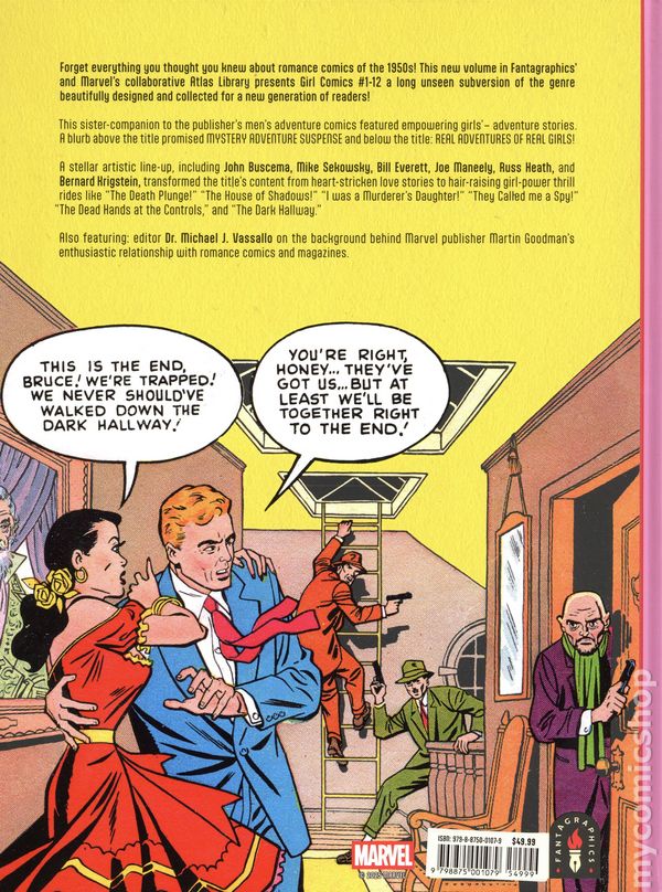 Volume 7 - 1st printing. "Girl Comics!" Collects Girl Comics (1949-1952) #1-12. Written by John Buscema, Bill Everett, Carl Wessler, Michael Dean, and Russ Heath. Art by Pete Tumlinson, George Klein, Al Hartley, Jerry Fasano, Bill Williams, John Buscema, Mike Sekowsky, Christopher Rule, Gene Colan, Hy Rosen, Joe Kubert, Sam Cooper, Bob Brown, Joe Maneely, Chu Hing, Syd Shore, Mike Becker, Marion Sitton, Bill Everett, Werner Roth, Joan, Bill Wash, Vern Henkel, Russ Heath, Bill LaCava, Carl Burgos, Mike Esposito, Ken Rice, Ann Brewster, John Tartagilone, Sol Brodsky, Allen Bellman, Dick Rockwell, Warren Broderick, Nina Albright, Cal Massey, Chic Stone, Morris Weiss, Frank R. Sieminski, Dan LoPrieno, Bill Savage, and Bernard Krigstein. Cover by Russ Heath, Pete Tumlinson, George Klein, Bill LaCava, Mike Esposito, and Al Hartley. Back Cover by Al Hartley. Introduction by Dr. Michael J. Vassallo. This new volume in Fantagraphics' and Marvels collaborative Atlas Library presents Girl Comics #1-12, a long unseen subversion of romance comics beautifully designed for a new generation of readers! In 1950, Timely/Atlas/Marvel took a typical romance title called Girl Comics and turned it into a sister companion to its successful men's-adventure comics: an empowering girls-adventure comic! Mystery, adventure and suspense was promised and delivered! At the hands of a stellar artistic line-up, including John Buscema, Mike Sekowsky, Bill Everett, Joe Maneely, Russ Heath, and Bernard Krigstein, Girl Comics evolved from heart-stricken love stories to hair-raising girl-power thrill rides like The Death Plunge!, The House of Shadows!, I was a Murderers Daughter!, They Called me a Spy!, The Dead Hands at the Controls, and The Dark Hallway. This volume also features the story behind the stories, with editor Dr. Michael J. Vassallo's essays on Marvel publisher Martin Goodman's enthusiastic relationship with romance comics and magazines at a time when the artform was cementing itself into American youth culture! Hardcover, 8-in. x 11-in., 336 pages, full color. Cover price $49.99.