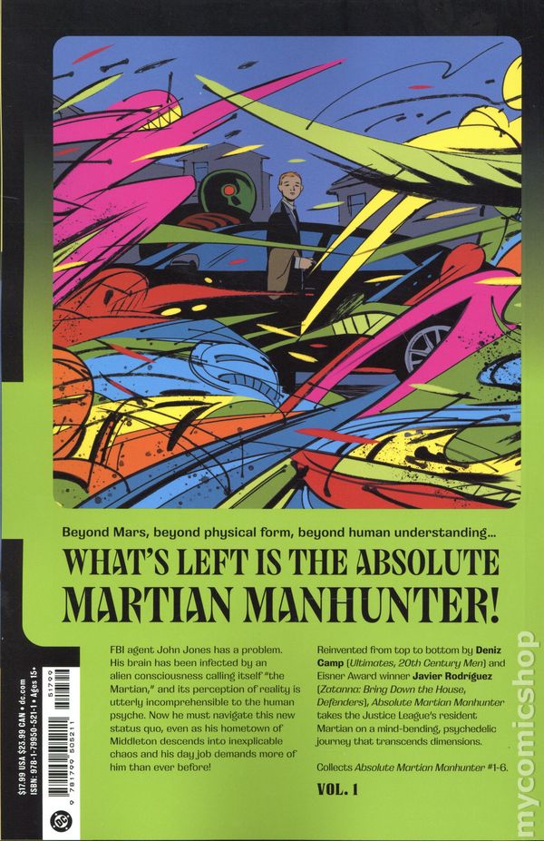 Volume 1 - 1st printing. Collects Absolute Martian Manhunter (2025 DC) #1-6. Written by Deniz Camp. Art and cover by Javier Rodriguez. FBI agent John Jones has a problem. His brain has been infected by an alien consciousness calling itself the Martian, and its perception of reality is utterly incomprehensible to the human psyche. Now he must navigate this new status quo, all while balancing the deeply grounded and important duties of his day job! Reinvented from top to bottom by Deniz Camp (Ultimates, 20th Century Men) and Javier Rodríguez (Zatanna: Bring Down the House), Absolute Martian Manhunter takes Justice League's resident Martian on a mind-bending, psychedelic journey that transcends dimensions. Softcover, 160 pages, full color. Teen+ Cover price $17.99.
