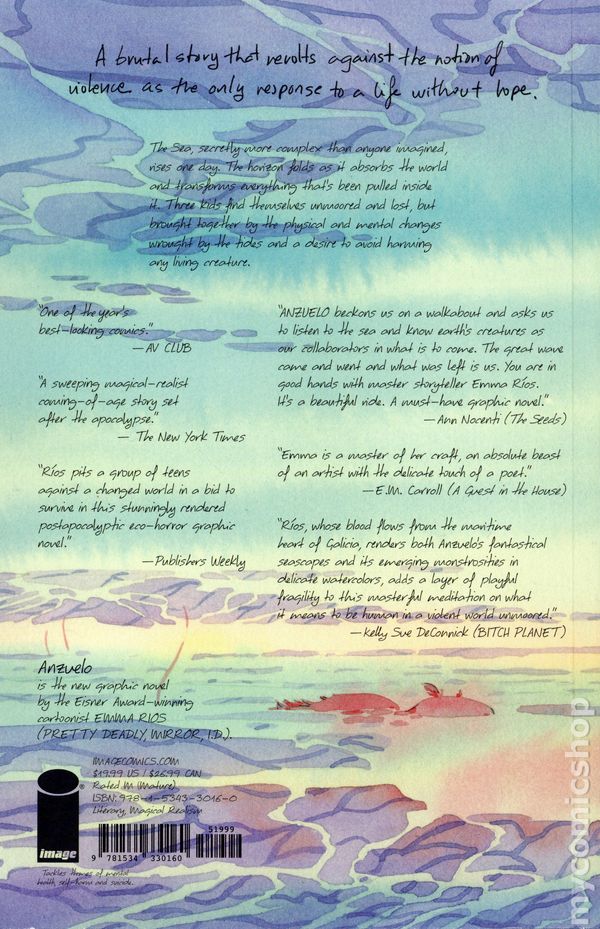 1st printing. Story and art by Emma Rios. A gorgeous and brutal story that revolts against the notion of violence as the only response to a life without hope. The Sea, secretly more complex than anyone imagined, rises one day. The horizon folds as the Sea absorbs the world and transforms everything that's been pulled inside it. Three kids find themselves unmoored and lost, but brought together by the physical and mental changes wrought by the tides and a desire to avoid harming any living creature. Softcover, 304 pages, full color. Cover price $19.99.