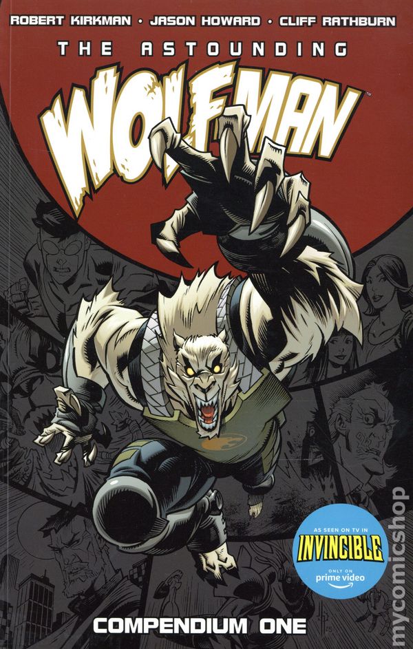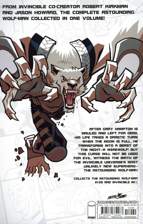 1st printing. Collects Astounding Wolf-Man (2007-2010) #1-25 and Invincible (2003-2018) #57. Written by Robert Kirkman. Art by Jason Howard, Ryan Ottley, and Cliff Rathburn. Cover by Jason Howard. AN UNLIKELY SUPERHERO RISES IN THE INVINCIBLE UNIVERSE! After Gary Hampton is brutally attacked and left for dead, he awakens to a terrifying new reality: he's faster, stronger, and cursed to become a werewolf every full moon! As the Astounding Wolf-Man, Garys determined to use his newfound power for good, but the line between man and beast is thin. Hunted and haunted by his own actions, Gary must fight to reclaim his humanity and embrace his monstrous nature to become an unexpected force for good. Witness the rise of The Astounding Wolf-Man in a complete softcover compendium from superstar team Robert Kirkman (INVINCIBLE, THE WALKING DEAD) and Jason Howard (TRANSFORMERS, SUPER DINOSAUR). Softcover, 592 pages, full color. Cover price $39.99.