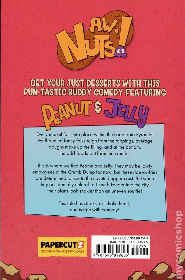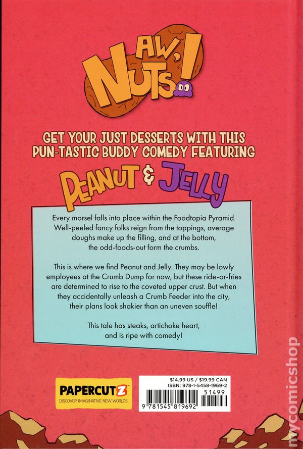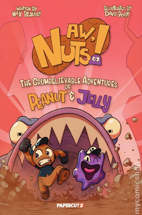 1st printing. Written by Max Beaudry. Art and cover by David Perry. Get your just desserts with this pun-tastic buddy comedy, featuring Peanut and Jelly!Every morsel falls into place within the Foodtopia Pyramid. Well-peeled fancy folks reign from the toppings, average doughs make up the filling, and at the bottom, the odd-foods-out form the crumbs.This is where we find Peanut and Jelly. They may be lowly employees at the Crumb Dump for now, but these ride-or-fries are determined to rise to the coveted upper crust. But when they accidentally unleash a Crumb Feeder into the city, their plans look shakier than an uneven souffle!This tale has steaks, artichoke heart, and is ripe with comedy! Softcover, 6-in. x 9-in., 88 pages, full color. Middle Grade Cover price $9.99.