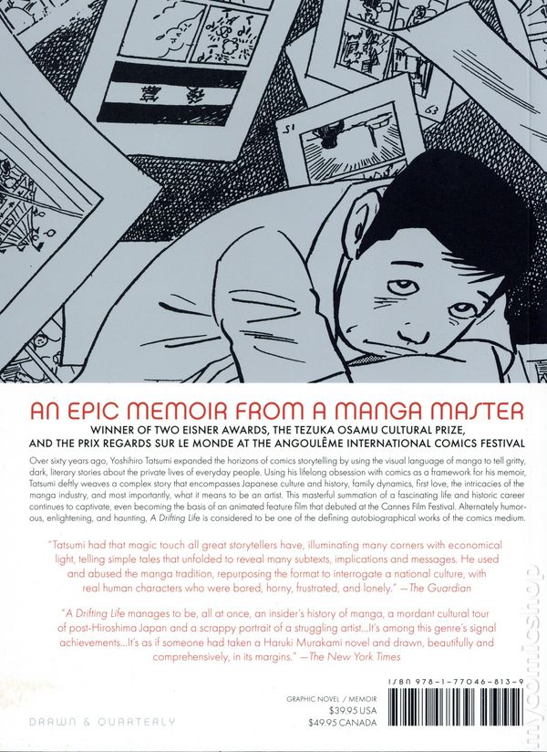 1st printing. Story and art by Yoshihiro Tatsumi. The award-winning memoir translated by Taro Nettleton with a new design by Adrian Tomine. In this memoir that won two Eisner Awards, the Tezuka Osamu Cultural Prize, a prize at the Festival de la BD d'Angoulême, legendary manga-ka Yoshihiro Tatsumi uses his lifelong obsession with comics as a framework to tell his life story incisively and unflinchingly. He deftly weaves a complex story that encompasses Japanese culture and history, family dynamics, first love, the intricacies of the manga industry, and most importantly, what it means to be an artist. Alternately humorous, enlightening, and haunting, A Drifting Life is the masterful summation of a fascinating life and a historic career. Over sixty years ago, Yoshihiro Tatsumi expanded the horizons of comics storytelling by using the visual language of manga to tell gritty, dark, literary stories about the private lives of everyday people, a genre he coined gekiga. A Drifting Life is Tatsumis most ambitious, personal, and heart-felt work and considered to be one of the defining autobiographical works of the comics medium. Softcover, 6 1/2-in. x 8 1/2-in., 840 pages, B&W. Teen+ Cover price $39.95.