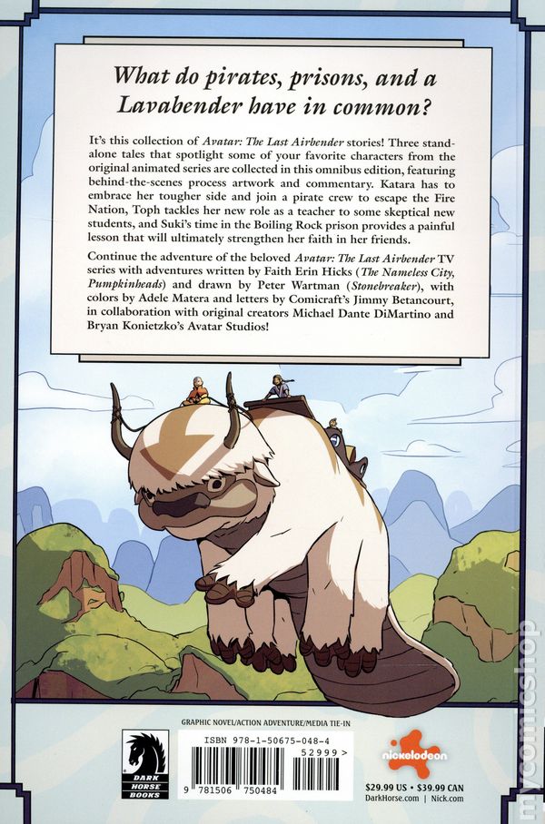 1st printing. Collects Avatar: The Last Airbender - Katara and the Pirate's Silver GN (2020 Dark Horse), Avatar: The Last Airbender - Toph Beifong's Metalbending Academy GN (2021 Dark Horse), and Avatar: The Last Airbender - Suki, Alone GN (2021 Dark Horse). Written by Faith Erin Hicks. Art and cover by Peter Wartman. Three standalone stories featuring Katara, Toph, and Suki are presented in one omnibus collection for the first time. What do pirates, prisons, and a Lavabender have in common? Its this collection of Avatar: The Last Airbender stories! Katara has to embrace her tougher side and join a pirate crew to escape the Fire Nation navy, Toph embraces her new role as teacher to some skeptical new students, and Sukis time in the Boiling Rock prison provides a painful lesson that will ultimately strengthen her faith in her friends. These three standalone stories are presented in an omnibus collection for the first time. Continue the adventure of the beloved Avatar: The Last Airbender TV series with adventures written by Faith Erin Hicks (The Nameless City, Pumpkinheads) and drawn by Peter Wartman (Stonebreaker), with colors by Adele Matera and letters by ComiCrafts Jimmy Betancourt, in collaboration with original creators Michael Dante DiMartino and Bryan Konietzkos Avatar Studios! Softcover, 5-in. x 8-in., 240 pages, full color. Kids to Adults Cover price $29.99.