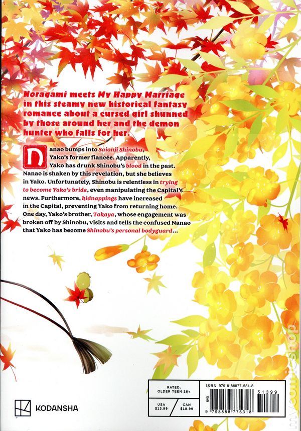 Volume 5 - 1st printing. Story by Midori Yuma. Manga By Mamenosuke Fujimaru. The much-anticipated webtoon comes to print! From the creator of Kakuriyo: Bed & Breakfast for Spirits and the artist behind Captive Hearts of Oz and the Alice in the Country of... series comes a steamy new historical fantasy romance about a cursed girl shunned by those around her...and the demon hunter who falls for her. Noragami meets My Happy Marriage in this mix of romance, action, and suspense that has already won legions of fans! Young, cheerful Nanao cant wait to marry her betrothed, Reito, the young lord of the Byakurenji family. But that changes one night when she is attacked by a vengeful yokai spirit--an ayakashi--leaving her scarred with the mark of a demonic curse. Her cousin Akemi seizes the chance to steal away her fiance, but it doesn't matter. Reito now finds her repulsive, and Nanao is forced to wear a monkey mask to hide her scar and live the life of an outcast. Years later, she meets Yako, the willfull young scion of another noble family. When Nanao's mask shatters after an accident, Yako sees her face and is drawn to her beauty and great spiritual power. But theres more to the handsome young lord then meets the eye, and when Yako offers Nanao a way out of her torturous life, the new life that awaits her is filled with more mystery and intrigue that she could ever imagine... Softcover, 5 3/1-in. x 8 1/4-in., 208 pages, B&W. Older Teen (16+) Cover price $13.99.