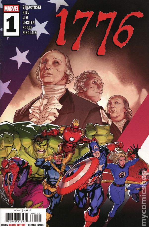 (W) J. Michael Straczynski (A) Ron Lim; SEAN DAMIEN HILL (CA) Paulo Siqueira REVOLUTIONARY WARRIORS, ASSEMBLE! Calamity strikes when a mysterious force dares to tamper with the sacred threads of history. CAPTAIN AMERICA and his formidable squad of Marvel heroes leap into action! Their mission? To safeguard the founding of the United States of America! The fate of the nation hangs in the balance at the dawn of the Revolution, as these valiant heroes must navigate the treacherous waters of the past to ensure a future that remains untarnished. 32 pages, full color, rated teen. Cover price $4.99.